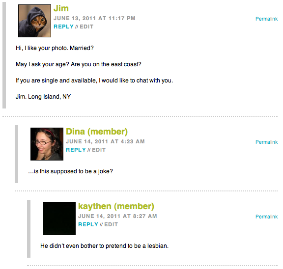 In fact, I’ve made some great online friends through both sites… I’ve struck up extended correspondence with several people, and we’ve learned a lot from each other. It’s scary “coming out” as a straight dude on these sites, sure…. but only maybe 0.0000005% as scary as the coming out you folks have had to do in life.