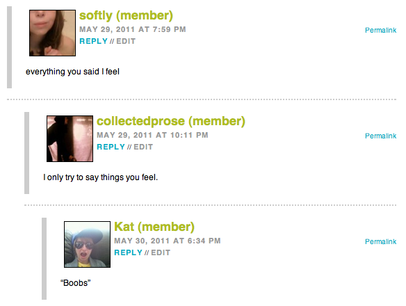 We’re starting off the Group of the Week feature with yodelmachine’s group, the name of which appears to have been taken directly from every conversation I (Brianna) have ever had in my life. It’s clearly therapy for awkward people which – admit it – includes you. Go. Join. And TALK! Talk about those awkward moments in your life, like that time you tripped while walking up a flight of stairs, or that one time you had to look at explicit pictures with your boss. #truestory #awkward
