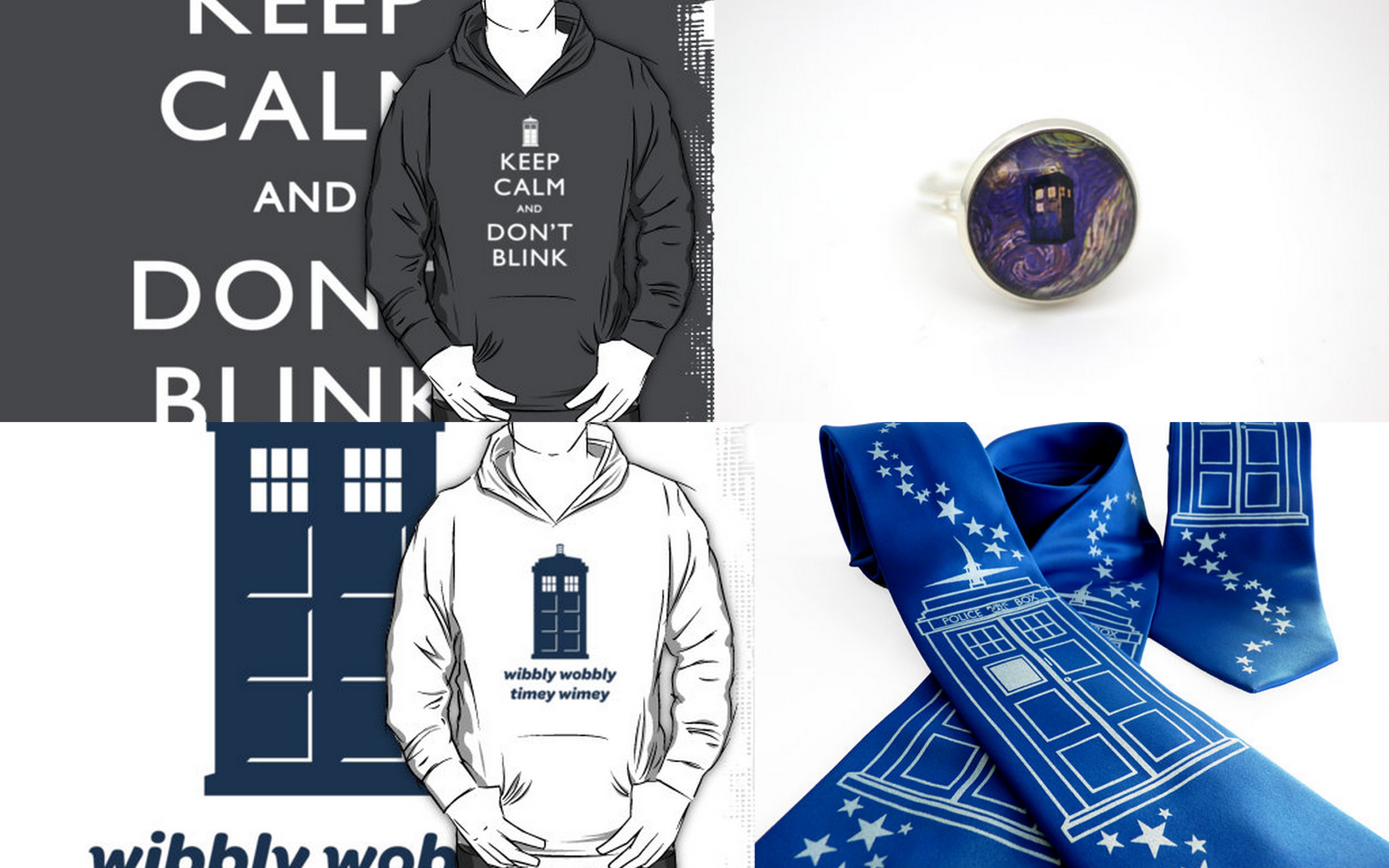 Want some bling on a ring? This Starry Night Tardis ring may be just the thing ($10). For the dapper among us, try a tie that’s bigger on the inside ($24).