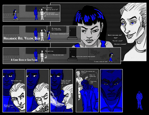 According to an article about the project in Bitch magazine, the story follows three characters, two women and a man, “each of whom has their own color that’s used only on their pages of the story. Two girls who get harassed are red and yellow, and the comic also follows a boy in blue who learns how to be a proactive bystander.” So, clearly, the work isn’t just aimed at women, but also at helping men to learn how to not engage in harassment and stop it when they see it – similar to campaigns like Men Can Stop Rape. You can hear more about Hollaback! Philly’s plans for the book with their fundraising video here: