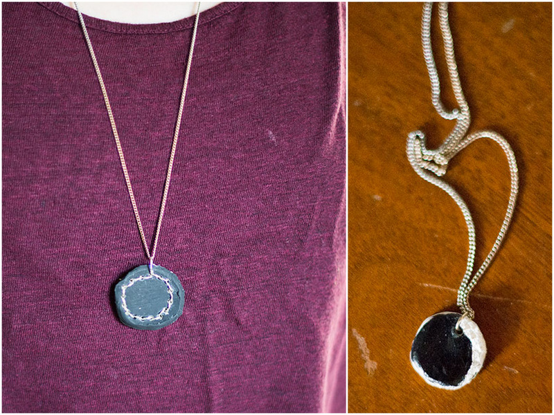 In case you’re anxious to use those new needle skills, this version of the clay moon pendant involves metallic embroidery thread.