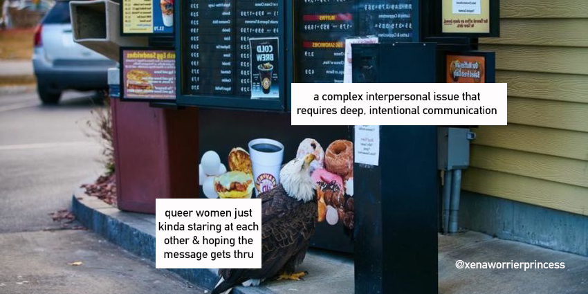 My name is Maddy and I make niche lesbian memes as @xenaworrierprincess on Instagram. I also make zines about queer relationships and love: The Ex-Girlfriend of My Ex-Girlfriend Is My Girlfriend and the sequel, The Ex-Girlfriend of My Ex-Girlfriend Is My Wife. The basic format is that @xenaworrierprincess followers send in their girl problems, chosen family feuds, and miscellaneous queer angst. I try to answer as much as possible, as thoughtfully as possible. My only hard boundary is that only queer people can submit.