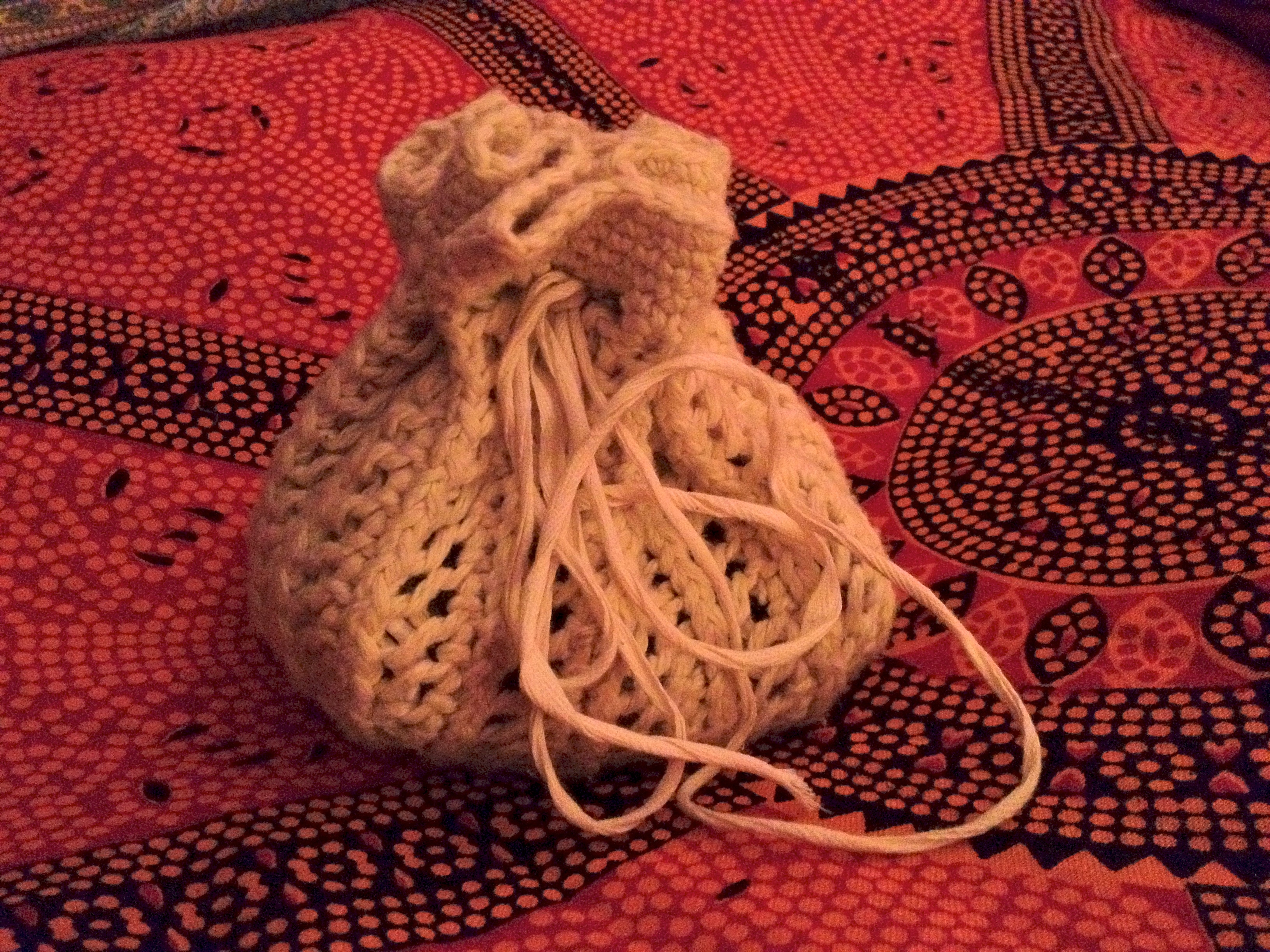 I made the first style of bag! It works even if you’re spatially challenged like me and decide to thread the sleeve strips through all of the sections, then tie them across. Yay!
