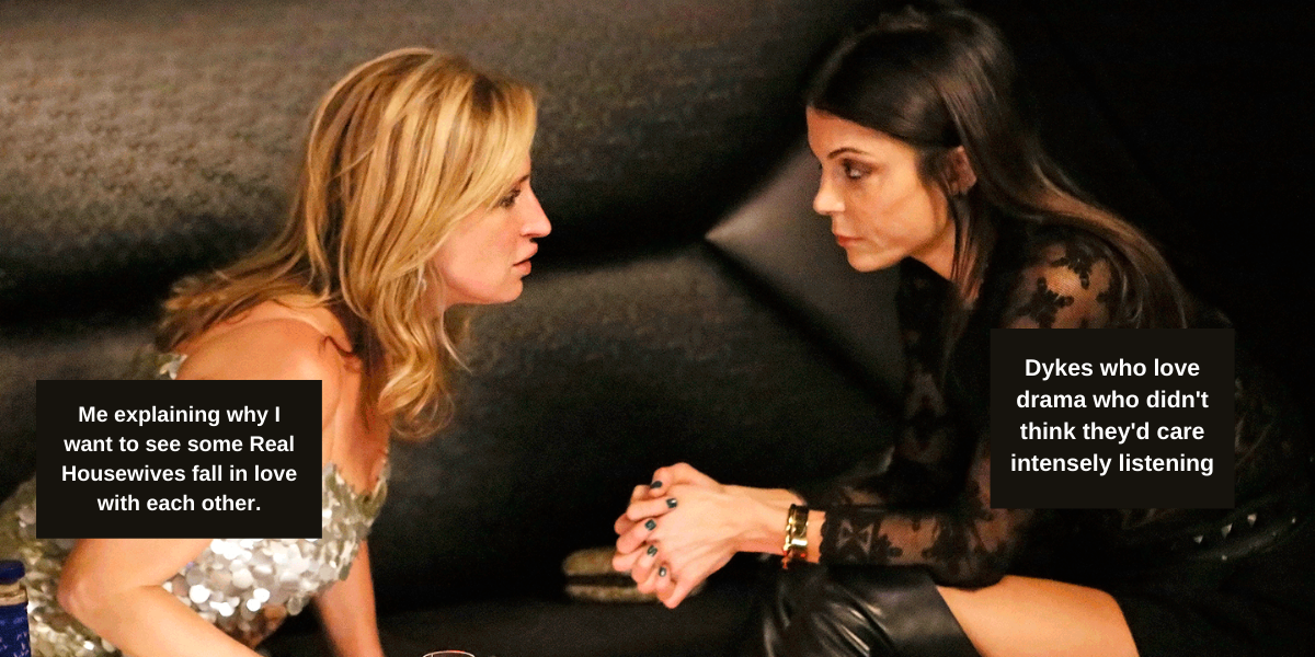Let me be clear: Do I want this to happen for the purposes of representation or visibility? No. Absolutely not. I want this to happen because I just simply do. Between watching the shows, following the blogs, reading recaps, speculating in various group chats, having hours-long conversations with my girlfriend, watching Watch What Happens Live, listening to the Bitch Sesh podcast, and following all of these human disasters on various social media platforms — I have put countless hours and so much physical and psychic energy into becoming a Bravo Dyke. But I do not crave to see myself reflected. Nay. I come to these shows specifically to leave this earthly plane and get away from myself. I cherish the knowledge that if I were in a room with many of these women they would simply ignore me. I do not wish to be perceived by the Housewives nor do I wish to relate too strongly to any of them (though it does happen).