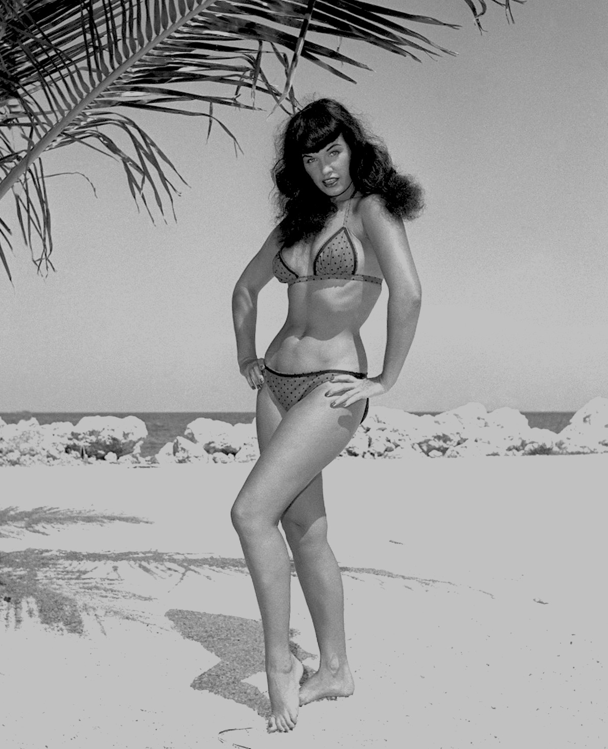 Bettie Page was born in 1923 on April 22, and by the fall of 1950 she was a (yawn) secretary. One day when she was casually walking along the beach alone (I’m melting) she met Jerry Tibbs, who became the first photographer of her new-fangled modeling career. A girl who used to pretend to be famous with her sisters as a teenager was living a fantasy of her own.
