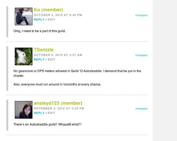 3. We’ll probably need a non-Autostraddle site to function as a forum of some kind, if we’re pretty serious about this. That way, we can help people join and organize whatever events and what-have-you without weirding out/clogging up the rest of Auto too much. A Twitter account could be good too, so once we see where we’d like this, I can set it up and pass on the reins. My suggestion for this is Livejournal, as that’s how my last guild went about things. I know LJ is super weird, but it’s easy to navigate and has message boards. I’m very, very open to other suggestions, with an eye for simplicity (we want to attract new Autostraddle readers to play, amirite?)