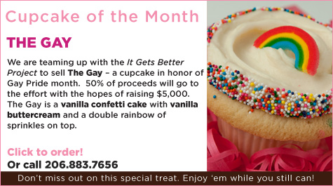 It’s pretty self-explanatory. Seattle bakery Cupcake Royale is selling a gay cupcake. 50% of cupcake proceeds will go to the It Gets Better project. There is no downside to this cupcake situation.