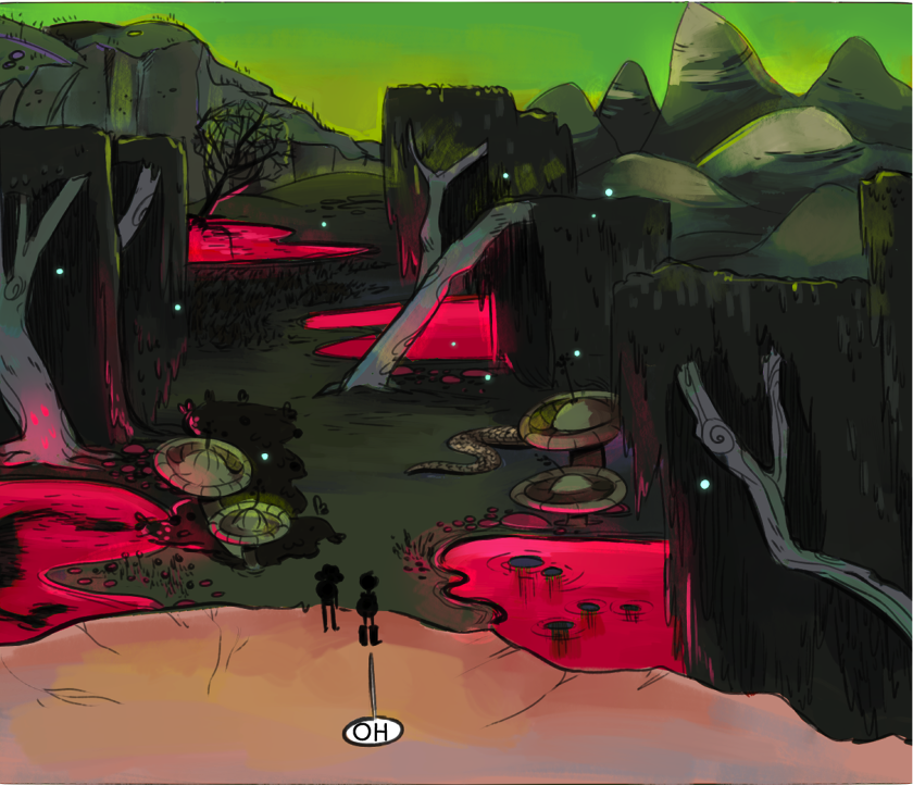 This comic has staggeringly beautiful colors. It looks like a painting or maybe chalk art, and you can absolutely drown in the worlds Layne draws. The environments and scenery not only are creative and brilliantly thought up, but they also have some of my favorite lighting and color choices that I’ve ever seen in a webcomic. The entire world is very dreamlike, and at times nightmare-like, which is extremely appropriate for a comic about a Demon world. The main characters, on the other hand, are drawn in a more cartoony way that is reminiscent of a wonderful mix between Bee and Puppycat and the Peanuts cartoons. This gives them a youthful and grounded appearance in an alien world, making it even more easy to relate to them and root for them.