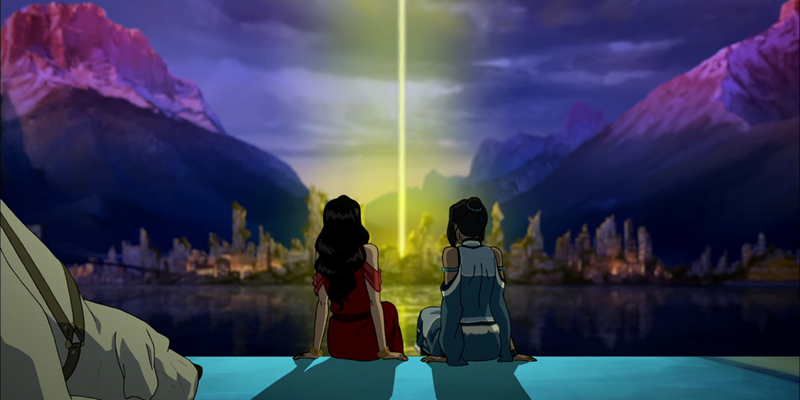 During her time away, Korra struggles with what to say in her letters to her friends, but the one person she feels she can open up to – eventually – is Asami. While season four could’ve done much more to expand on even the friendship that was built between Korra and Asami in season three (they aren’t even together for most of the episodes in season four), that particular detail is one that, I think, can’t be overlooked. And, the friendship that was established between the two of them along with Korra’s self-journey through her recovery, helps diminish the sense that this is another story of two queer women trauma-bonding.