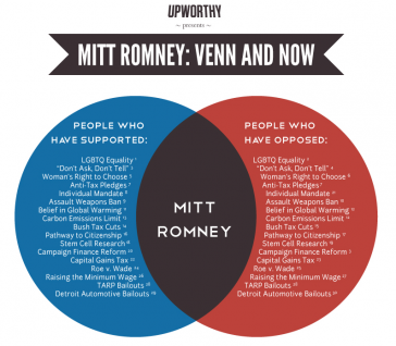 So that all looks like fun. But to me, Frank’s specific predictions are less interesting than his general insights into Romney’s motivations. Frank points out that “it’s kind of hard to accuse Mitt Romney of misrepresenting his positions, because he clearly doesn’t have any . . . there is not an issue of public policy (except that rich people shouldn’t pay much in taxes) on which he’s shown any consistency.” Frank’s not saying anything new here – there are memes, items of clothing, and even Fox News articles about Romney’s little switcheroo problem. His own staffers and confidants are finally owning up to it, too, and they seem to think it might be what scuttles him: