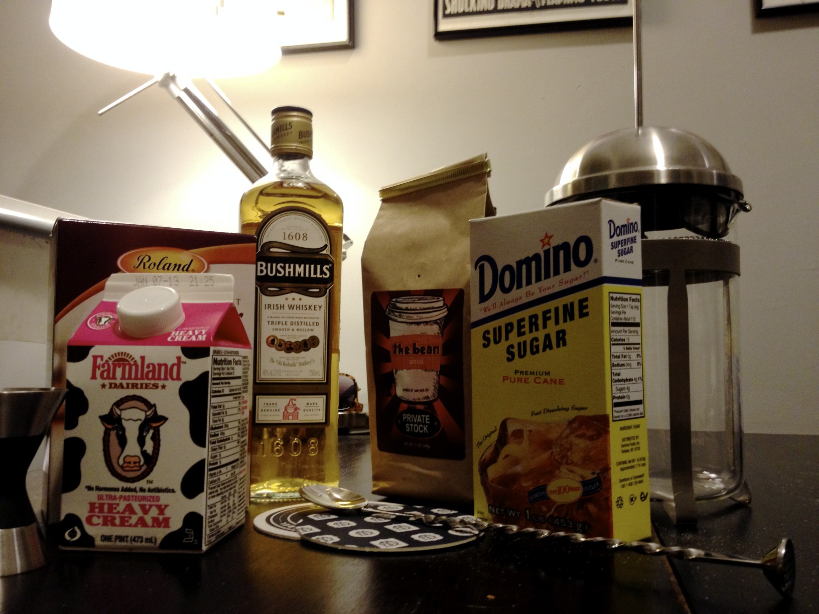 The thing about Irish Coffee is that it’s only as good as your base ingredients, so even though I’m lazy in the morning and use my Keurig, I went ahead and used the French press and some freshly ground coffee beans for this cocktail. I also emailed my mother and got the recipe she uses for homemade whipped cream (the kind that goes on top of my father’s chocolate cream pie). See, I have this thing about my cocktails. Yes, my machine-made Keurig and commerical whipped cream are good for the everyday, but if I’m going to be enough of a lush to make myself this gorgeous, delicious cocktail, I am not going to make it the fast food of cocktails. I’m going to use solid ingredients because it is going to taste so fucking good. You can use whatever coffee and whipped cream recipe you’d like, but I’m going to offer up my recipes for all the components, not just the cocktail itself. Besides, my mom’s whipped cream is awesome (and also probably similar to all of y’all’s parents’ whipped cream, as there are only so many ways to make whipped cream). I did some sweet, sweet modifications on the recipe used by the owner/mixologist at Little Branch, published in Speakeasy Cocktails.