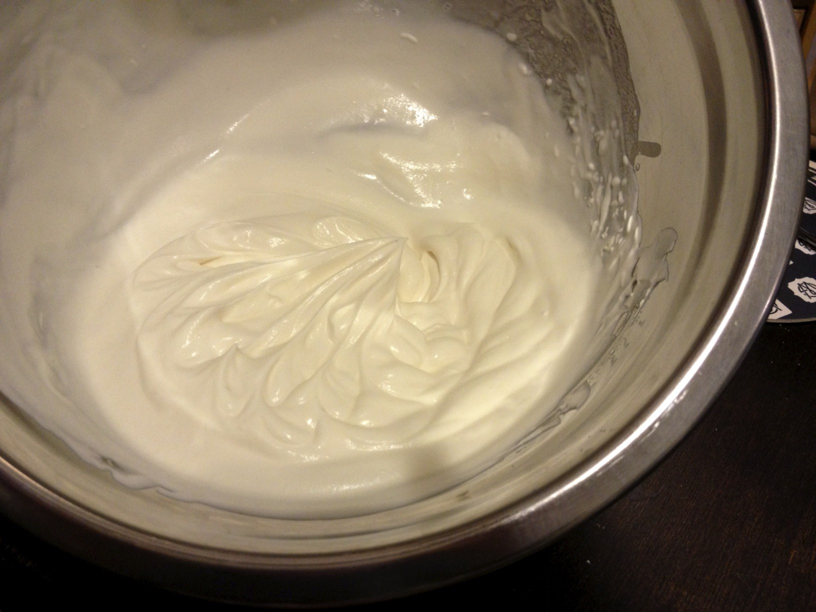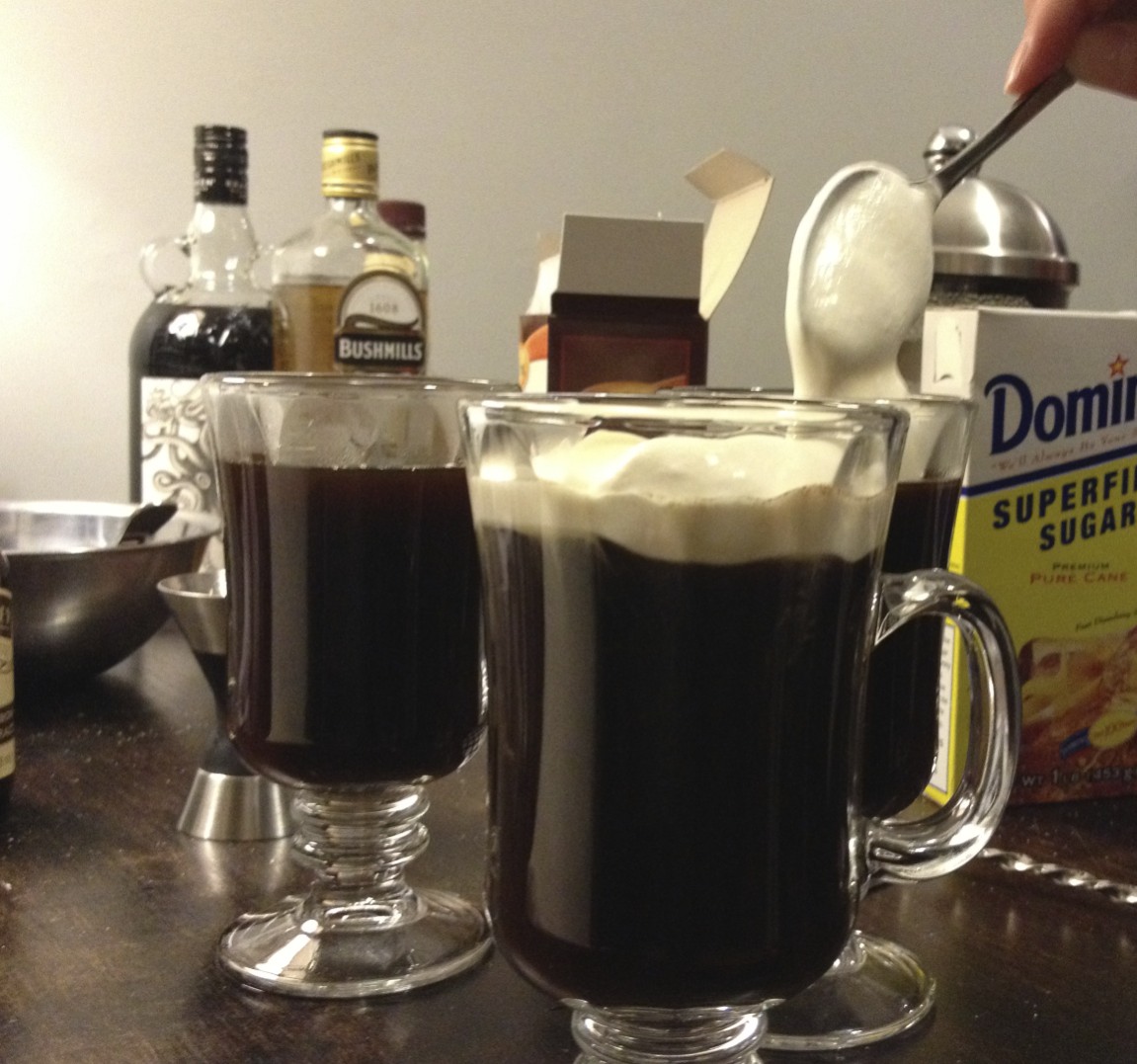 Start with the whipped cream. Combine the sugar, vanilla, and cream in your metal mixing bowl. If you want a nice, quick whipped cream, use a hand mixer like my mother suggests. Or you could be like me and not own a hand mixer, so you take turns whisking the shit out of the cream with your girlfriend. Beat it until peaks form. According to my mother, the trick is knowing when to stop. Whisk too long and you’ll make butter, and butter does not go well with Irish Coffee. I even whisked a little too short because I don’t want fluffy clouds of whipped cream, but rather a thick, almost-foam for the top of my cocktail. Put the whole mixing bowl in the fridge and move on.