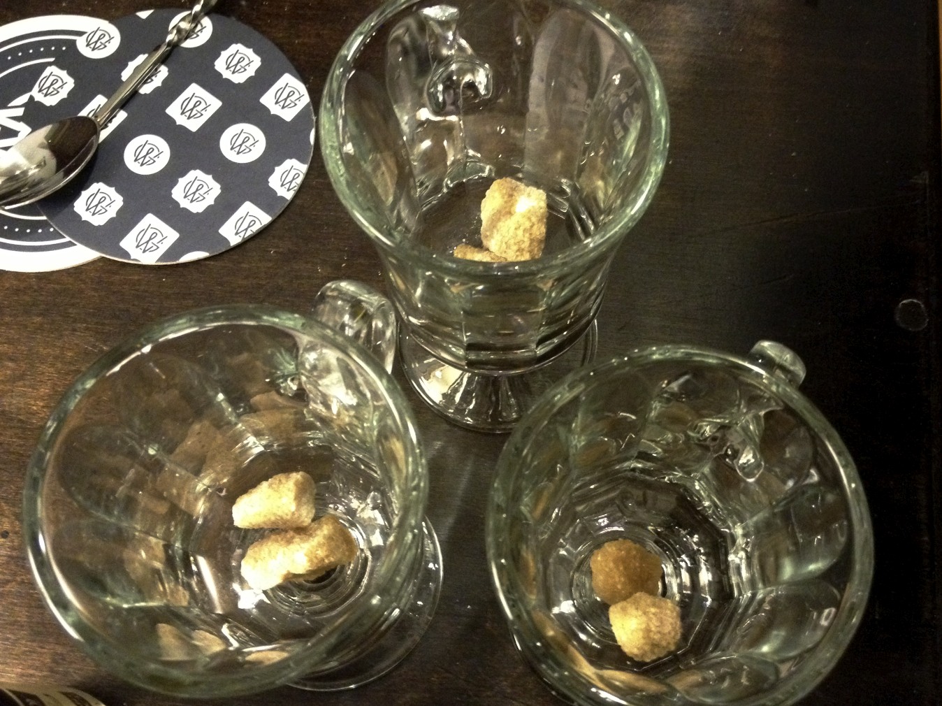 Now for the boozey part. Put two brown sugar cubes into each glass and fill half-way with coffee. Break up the sugar cubes with the flat end of your muddling spoon Use your jigger to measure an ounce and a half of whiskey into each glass. Fill the rest of the cup with coffee.