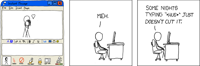 Side note: we’re in a poly relationship, so she has a gf who lives near her right now, but I have no hard feelings toward her, and actually think her gf is pretty awesome. I trust her with my life and trust that she wouldn’t ever cheat or anything. And I had a gf over the summer (which didn’t work out) and now have a huge crush on a guy (I’m biromantic) and she’s nothing but happy for me when I get dates with other people. Visiting isn’t really an option for a while, since neither of us has a job and we’re both poor students who live over 500 miles apart, but once it will we both know it will be extra-special. I can’t send or receive mail to/from her, because my parents freak out about me dating and would never approve of us, so we have very minimal contact most of the time, but we’re more of a silent support system for each other and understand just about everything without even having to talk much.