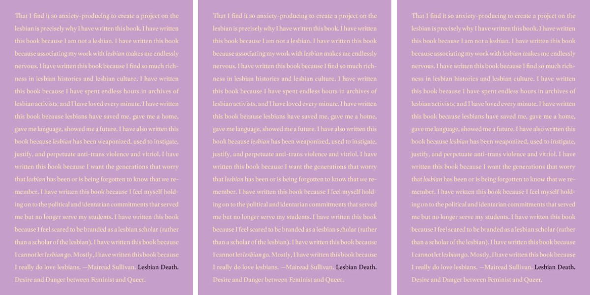 “That I find it so anxiety-producing to create a project on the lesbian is precisely why I have written this book. I have written this book because I am not a lesbian. I have written this book because associating my work with lesbian makes me endlessly nervous. I have written this book because I find so much richness in lesbian histories and lesbian culture. I have written this book because I have spent endless hours in archives of lesbian activists, and I have loved every minute. I have written this book because lesbians have saved me, gave me a home, gave me language, showed me a future. I have also written this book because lesbian has been weaponized, used to instigate, justify, and perpetuate anti-trans violence and vitriol. I have written this book because I want the generations that worry that lesbian has been or is being forgotten to know that we remember. I have written this book because I feel myself holding on to the political and identitarian commitments that served me but no longer serve my students. I have written this book because I feel scared to be branded as a lesbian scholar (rather than a scholar of the lesbian). I have written this book because I cannot let lesbian go. Mostly, I have written this book because I really do love lesbians.”