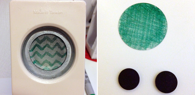 3. Cut them out. I like to use a shape puncher because I’m lazy and I feel it necessary to have matching shapes for earrings and I have zero abilities to cut in straight lines with scissors, much less perfect circles. Maybe you’re really good at tracing circles and cutting them out. Go ahead and do that. I envy you. For reference, my shape puncher is a little larger than a quarter and my earrings shrunk down to smaller than a dime. They really take their name seriously.