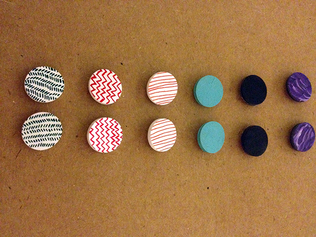 2. Draw or paint or stamp on your Shrinky Dinks plastic pages. If you’re using Ruff ‘n’ Ready (the name kills me), color on the rough side. Go bananas with it. I did some wonky chevron, some assymetrical herringbone, some not straight lines, and some random globs of paint. It doesn’t have to look that great, but just don’t smudge it because smudges become 329% more noticeable when they shrink.
