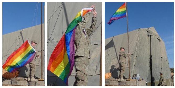 Like all good political drama these days, the controversy at hand here begins with a photo + social media. Late last month, Nicole Jodice uploaded a photo of a man in military garb raising a rainbow flag to the Wipeout Homophobia Facebook page. In the photo’s caption, Jodice identifies the man as her husband, a U.S. soldier deployed in Afghanistan.