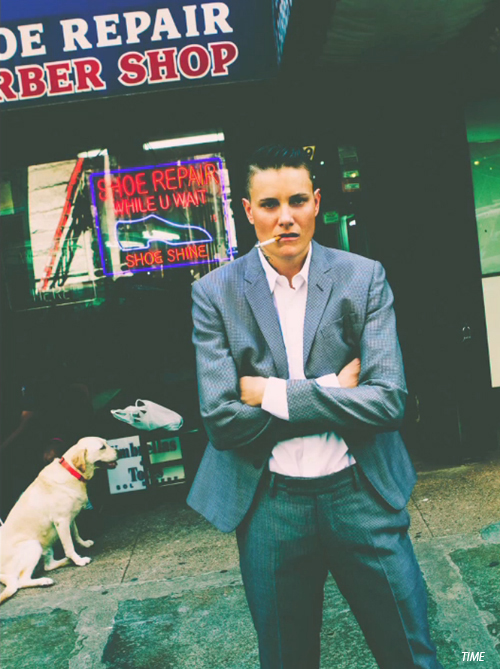 I mean, she’s taller than I am, clocking in at 6’2″. So I definitely don’t mean literally. But she’s a masculine of center woman. And she is comfortable in her body, comfortable enough to walk a runway and be in front of a camera constantly. I felt a lot feelings when I heard her voice, because it’s not deep. Mine isn’t either. I am so constantly self-concious of the way that I sound (like Minnie Mouse and a valley girl had a baby) and the vocal mannerisms I employ when I am talking (entirely my mother’s.) I feel like I should sound–I don’t know– butcher. Somehow. Legler is a fucking male model and her voice, while not quite the Minnie Mouse timbre of mine, is higher on the register. And she rocks it.
