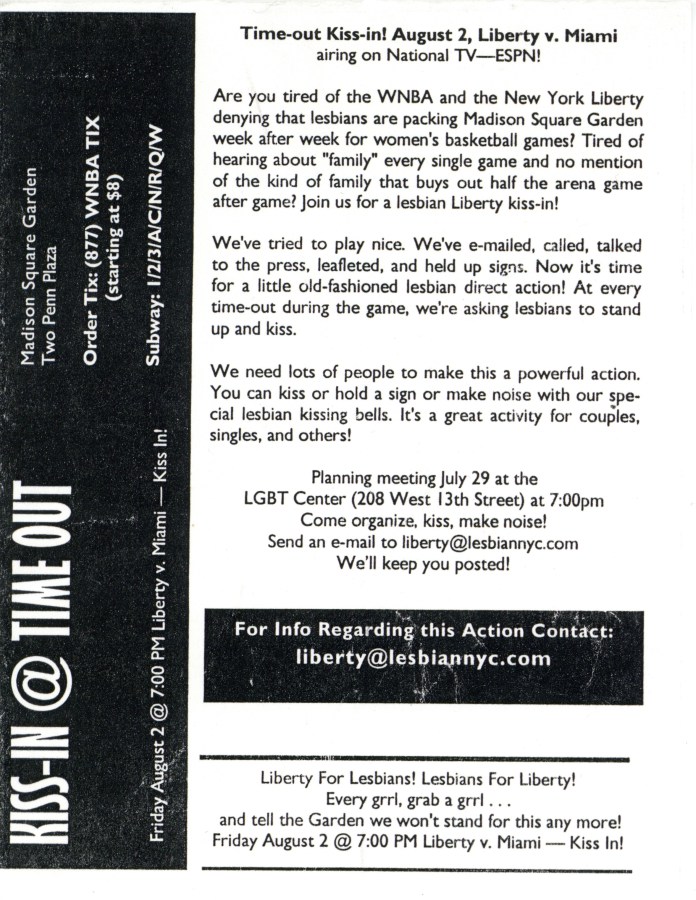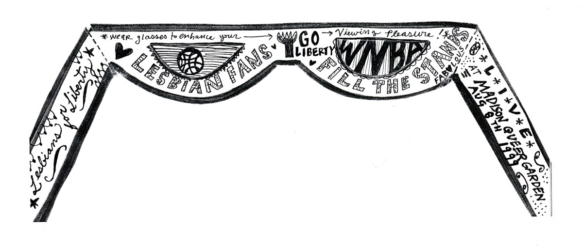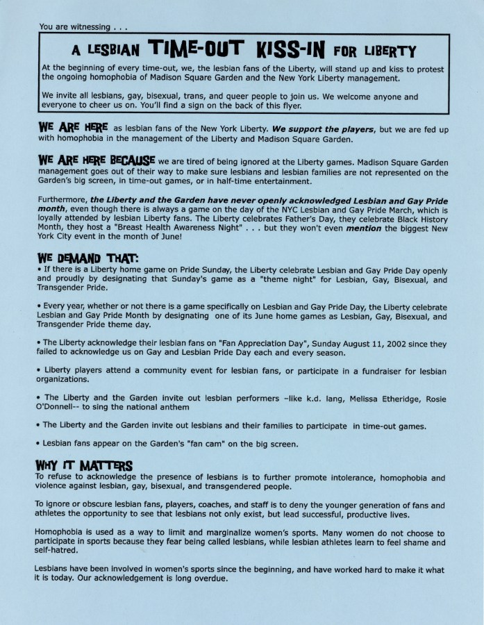 At the time, despite the visible and vocal presence of queer fans in the stands, the Liberty’s marketing and outreach remained largely silent on LGBTQ+ representation. In response, fans organized under Lesbians For Liberty to make their presence impossible to ignore. They brought protest signs — many of which are featured in the exhibit — wrote open letters, and applied pressure to the organization to acknowledge and celebrate the community that had long supported the team. Among the materials preserved in the exhibit is a flyer with detailed instructions for a “Lesbian Time-Out Kiss-In for Liberty,” inviting “all lesbians, gay, bisexual, trans, and queer people” to stand and share a kiss during every time-out in a game as a peaceful act of protest and visibility.