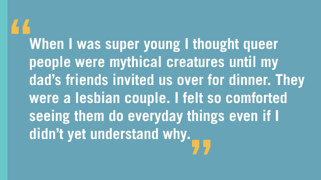 My queer adult allies gave me resources. They answered my questions honestly and connected me with other people within the community. Most importantly they could recommend books, TV shows, and music with queer characters so I could see myself in them.