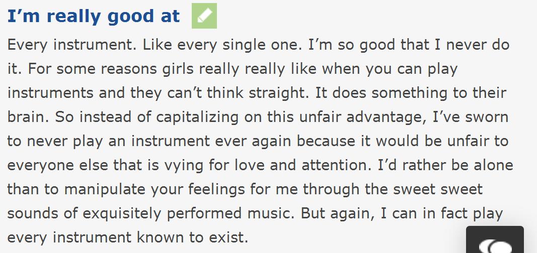 Subtlety makes people pay attention. Even though you might be the most earnest person in the world and every word of your profile may be true, everyone assumes you’re putting on airs. And if you’re not putting them on, maybe you should be. When everyone is trying to put their best foot forward, people tend not to take things at face value. You have to keep in mind that quick shallow judgments will be made about you. The online dating profile is a constant battle of what it says versus what it means.