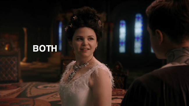 Flashback to that moment when Regina showed up to Snow and Charmin Bear’s wedding and told everyone that they dun goofed. Snow charges out of the room, followed by Charmin, and says she needs to ice Regina. But first, let’s honeymoon! Grumpy says he couldn’t help but “overhear” Snow and Charming discussing their plans to go to a secluded place and bump uglies. Right. Snow’s got an ulterior motive to choosing the summer palace, which makes more sense than “You know where I want to go? Somewhere that reminds me of my parents. I want to be continually reminded of my parents on my honeymoon because that’s sexy. I want to be doing it but also thinking about how special this was for my parents and thinking about my parents while we’re doing it.”