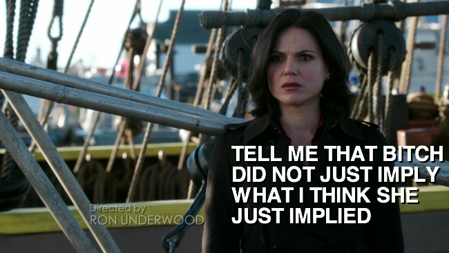 A lot of it? Is this floozy for real? We owe mother-fucking ALL OF IT to Regina. Let me recap for you dumb bitches. Y’all head to Neverland minus a plan. Who comes up with the plan? Regina. Y’all get caught up in your love triangle and conception needs. Who leaves your dead weight and finds the only other effective person on the island? Regina. Y’all need to get into the enemy camp. Who magics the Lost Boys into submission? Regina. Y’all need to do dirty work to get the end results. Who is the only one willing to do said dirty work? Regina. Y’all need to move the moon. Who has been training Emma all this time so the two of them can move the moon? Goddamned Regina. Y’all need to get out of a trap held tight by your regrets. Who regrets 100% nothing? REGINA MOTHER-FUCKERS. Y’all need to do every single one of these things and do it fast if you’re gonna save Henry, and who made those things happen? R-E-G-I-N-A.