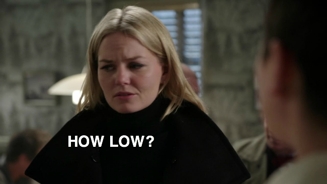Quick question for the writers: Regina’s son has been returned home after a grueling and scarring ordeal, and yet we have not seen the two of them together as mother and son or together, period. It’s been fifteen minutes of screentime already, and Regina’s acting like Henry is a friend of a friend she ran into in the grocery store. You know, like when you see them in the meat section but you kind of avoid making eye contact and then you run smack into each other in the cheeses so you have to actually say hi and acknowledge each other but then you keep passing each other in the more narrow aisles and do you smile or do you keep saying hi or do you laugh awkwardly or do you stare at your feet or what? ANYWAY. I really hate when you guys, the writers, which is a term I am using loosely, shove the characters around in miniature episode interactions that completely deny them their actual personality traits or actions congruent with their arcs thus far. But hey, I’m the one who sat down to watch this festering sore of a show. I knew what I was in for when it started, and I should own my mistakes.