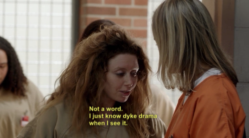 Piper asks Healy if she can switch prisons because this one is being mean to her and hurting her feelings. Healy asks if the lesbians are responsible. I imagine Healy alone in his basement late at night, mapping out on his walls hundreds of newspaper clippings and crumpled photographs. Red yarn connects the crisis on Wall Street and world hunger and the twinkie shortage and World War One and – yes! He’s done it! All signs point to LESBIANS!