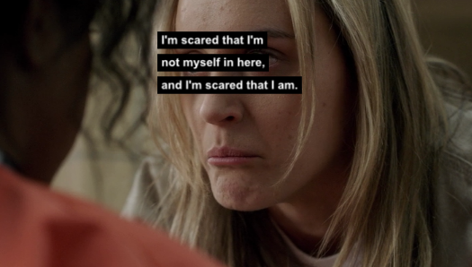 The Scared Straight kids are getting a tour of the bathrooms, which is actually the scariest thing they could be shown, lezbihonest. The inability to poop in privacy would probably drive at least 3 or 4 people out of the desire to go to jail. Everyone is telling the kids that Piper is the one you wanna watch out for, or she’ll shove quinoa down their throats and make them listen to Fresh Air. JK, they’re pretending she’s a nasty mean lesbian who runs the joint. Girl gang leader, whose name is Dina, thinks it’s all an act, specifically the lesbian part. She’s probably going to make a tumblr post about label politics later.