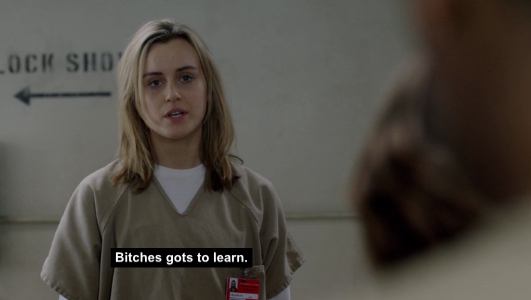 Piper attempts to be nice to Dina, but Dina reacts with some choice expletives. Well, Piper’s had enough of the whole “how my sexuality has gone over in jail so far” thing, and she breaks it down to Dina.
