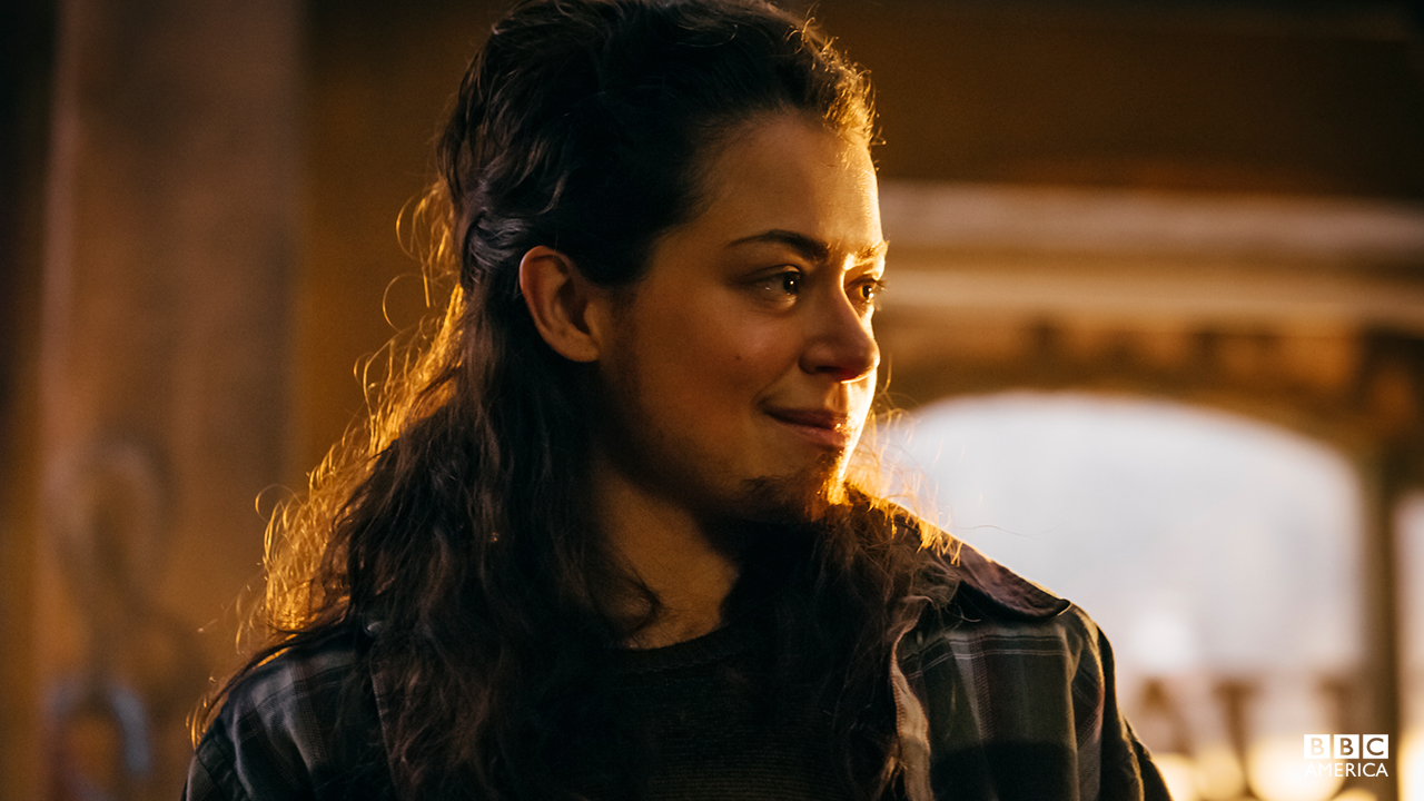 The camera then zooms in on Tony, and we see Tatiana Maslany in a mullet wig and a goatee. We have a brand new clone and he’s a trans man!