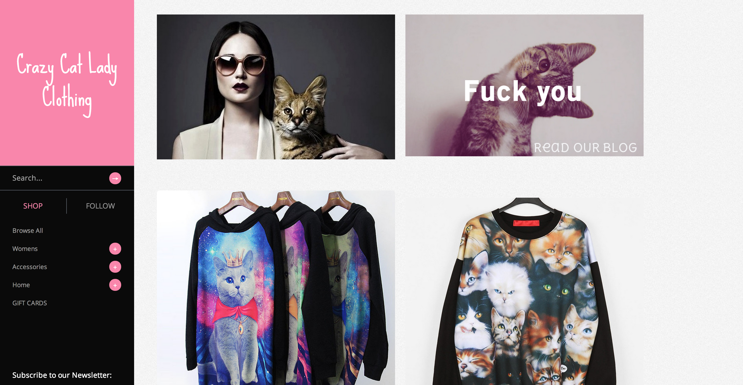 With reassured confidence, I was able to use the skills I had acquired by running Lucky 7 Shop to put together Crazy Cat Lady Clothing. It’s a funny, lighthearted concept and one that people can understand very quickly, since the name says it all. I also created an accompanying blog features mainly adorable and humorous cat photos and artwork, and tries to present it in a quirky and visually appealing way. Thus far it’s been very successful at driving traffic to the store.