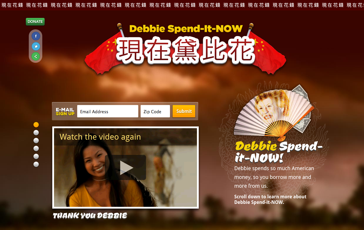 With this ad, Hoekstra is alienating people like me, American-born citizens of the US, while continuing a variety of racist assumptions — among them that people who are racially Asian are born abroad (and somehow intimately connected to China and this fear-of-China issue), and that people who look Asian are somehow not going to understand English or speak English grammatically. The other “ethnic” flourishes in the ad are also frustratingly trapped in “Yellow Peril” land — like the gong introductions, traditional Chinese music and the images of “rice paddies” in the background (though, according to POLITICO, the entire ad was shot in California). Not to mention how this campaign has been overly thought out — Hoekstra’s campaign even created a website, DebbieSpenditNow.com, that comes complete with Chinese characters decorating the borders, images of dragons and lion dance costumes and paper fans emblazoned with Stabenow’s face.