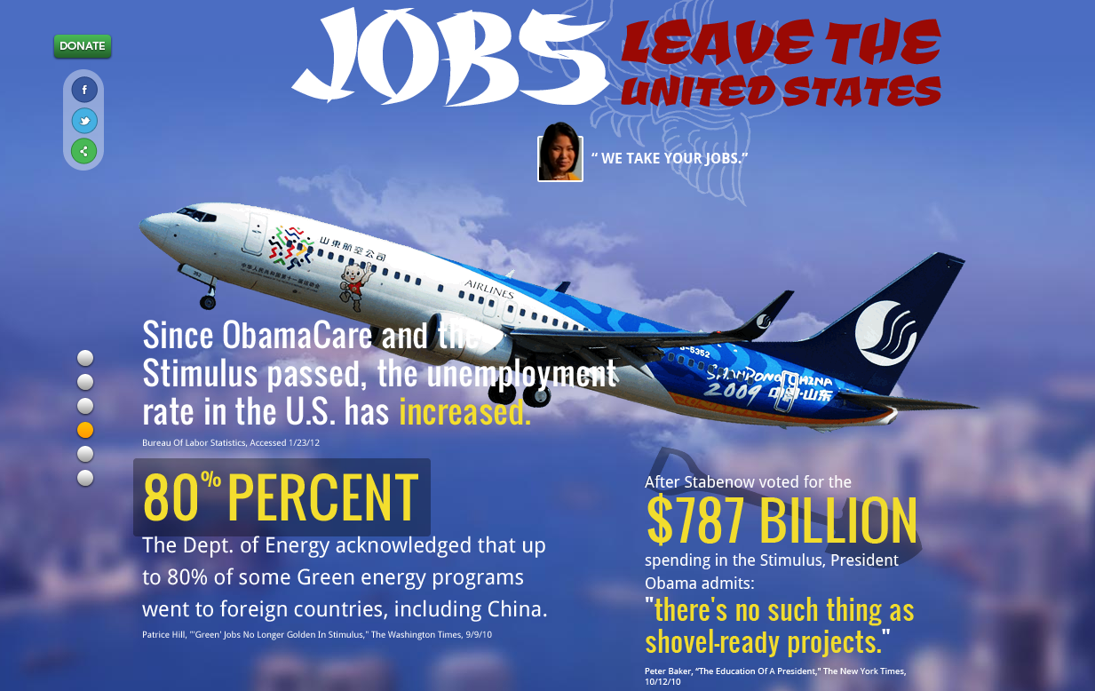 The number one racist problem in this ad is that the Asian/American actress’s lines are written with fake grammatically-incorrect tics, and yet she speaks in an American accent. It’s an attempt to make her seem more foreign, but lines like “Debbie spend so much American money” and “your economy get very weak, ours get very good” are not even realistic — I don’t think I’ve ever heard anyone talk like that, let alone people who have spoken Chinese as a first language. Hoekstra defended the use of this actress, saying that she was “100% Chinese,” in an interview with MSNBC anchor Lawrence O’Donnell — possibly the vaguest statement I have ever heard. The fact that Hoekstra hired an Asian actress to star in this anti-Chinese ad is the most upsetting — it rings back to the discomfort I felt watching the Georgia anti-childhood obesity ads, where the ad campaign hired an actor of a certain demographic to speak in a way that ostracizes and others people of that same demographic.