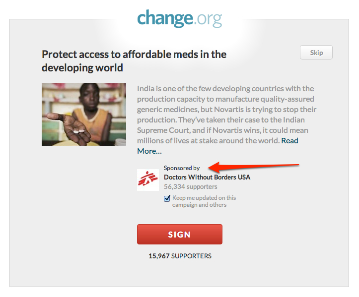 To make it clear that there will be no assumed endorsement by Change.org of the organizations sponsoring petitions on our platform, going forward we will call them advertisers, not “clients” or “partners.”