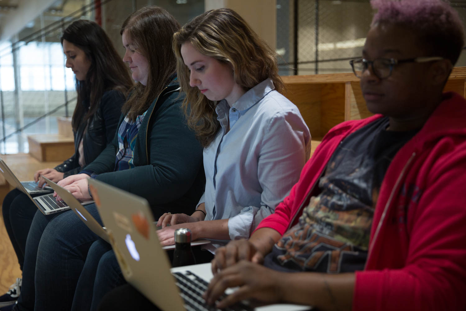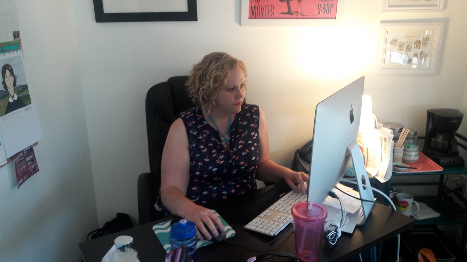 “We’re a bunch of queerdos working in advertising/marketing, doing everything from production (Deniese), community strategy (Katie, Blake) and analytics (Kate). Here are our very staged photos of us “working” on our laptops!”