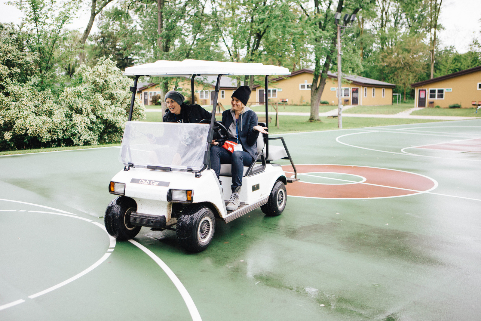 “Here I am at my second job: Program Support Director at A-Camp. In this photo, Robin is “living her dream” of driving a golf cart through woods full of queer people. A-Camp is exhausting and the only time all year that I willingly wake up before 7am for an entire week, but it’s always totally worth it. We make our own world up there.”