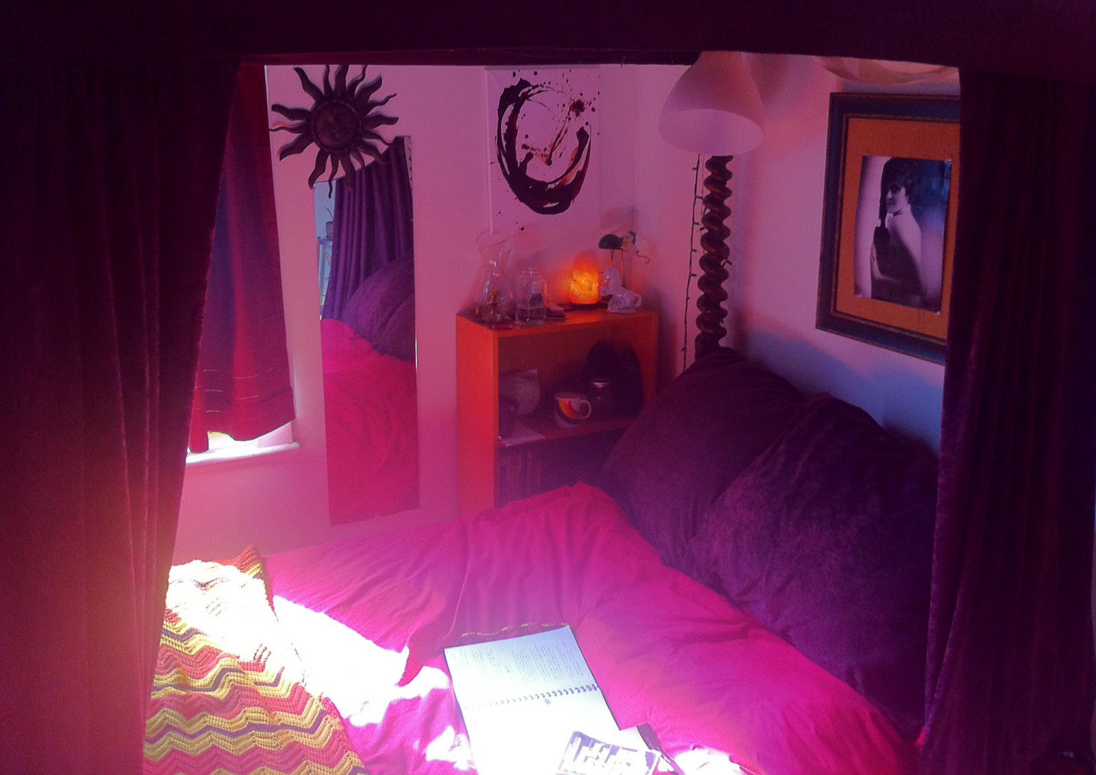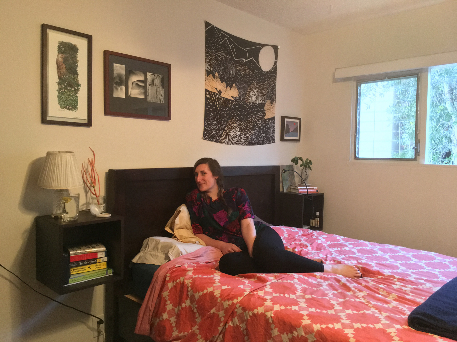 “I spend 20 hours a day in this cozy cove of a bed. I eat, write, craft, and share sexy good times here. The 4-poster bed once belonged to a friend, when he was a child in Indonesia. The artwork is the 4th in a series I began in March 2016, using the blood in my menstrual cup. The image of me on the wall was taken in Sydney when I was 21, and had just discovered how much I like kissing ladies.”