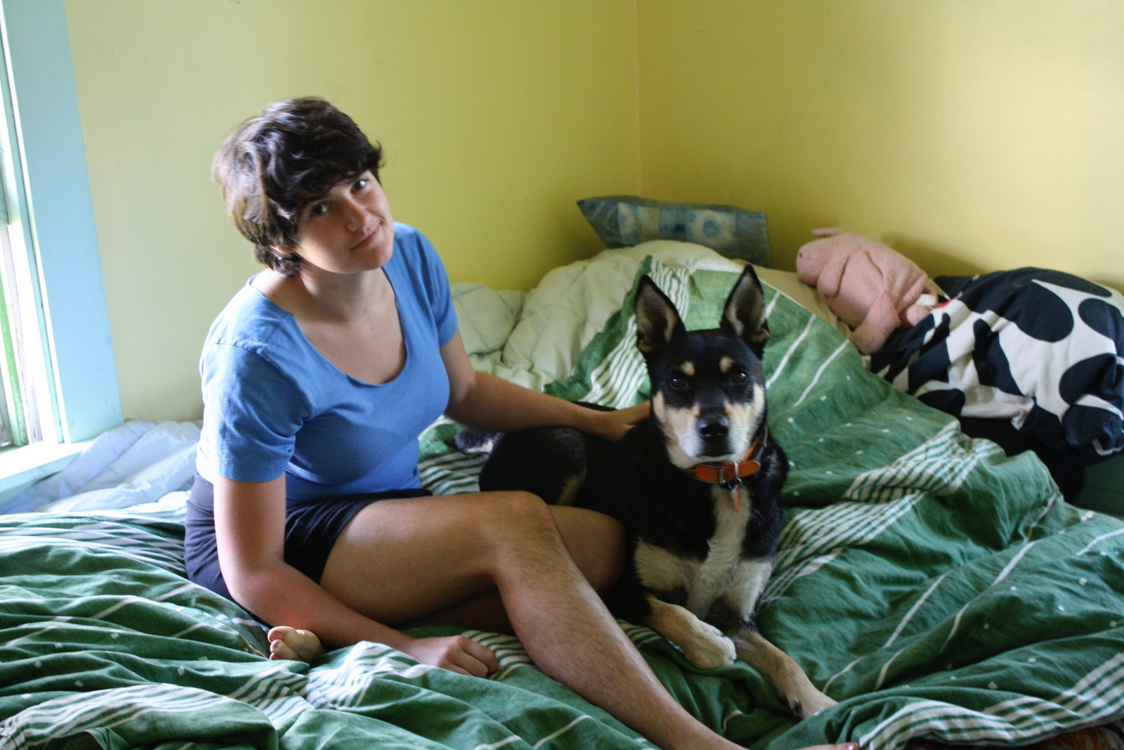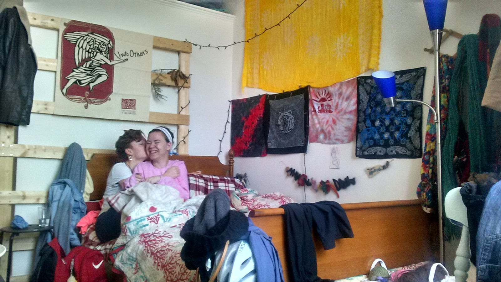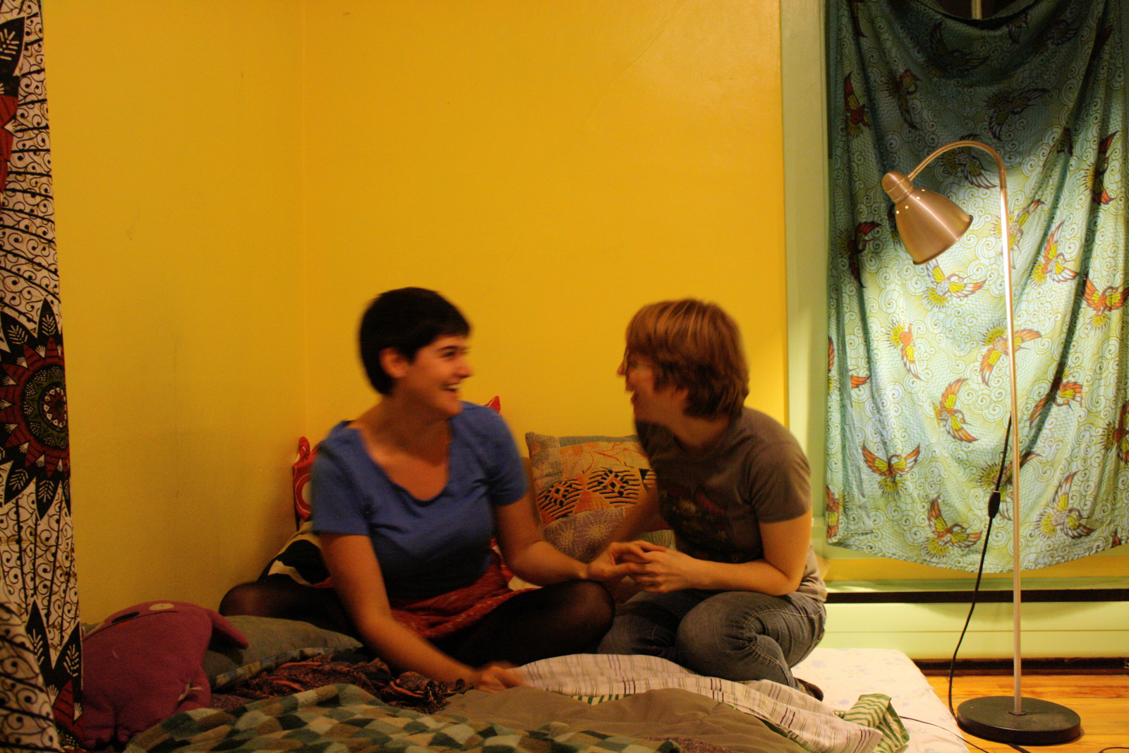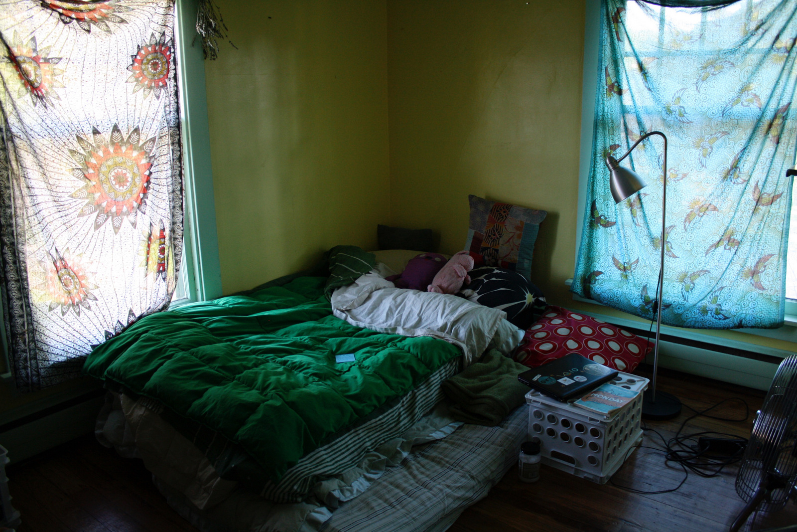 “The room looks over an abandoned elementary school playground, but neighborhood children are always playing there so we can hear their laughs and games through the windows. We have a twin mattress we found in the attic on top of a futon. The last thing I (Abby) think about is how good Clara’s arms feel around me and how I wish the dog would stop barking!”