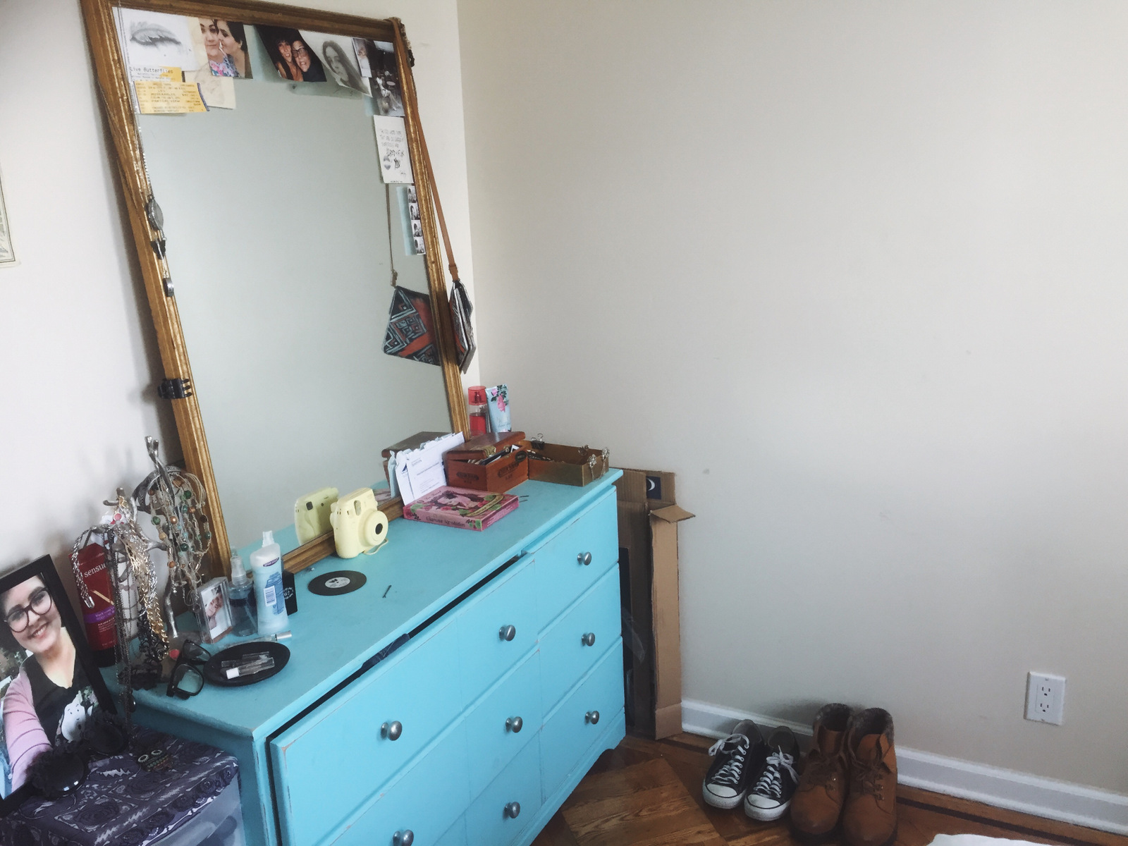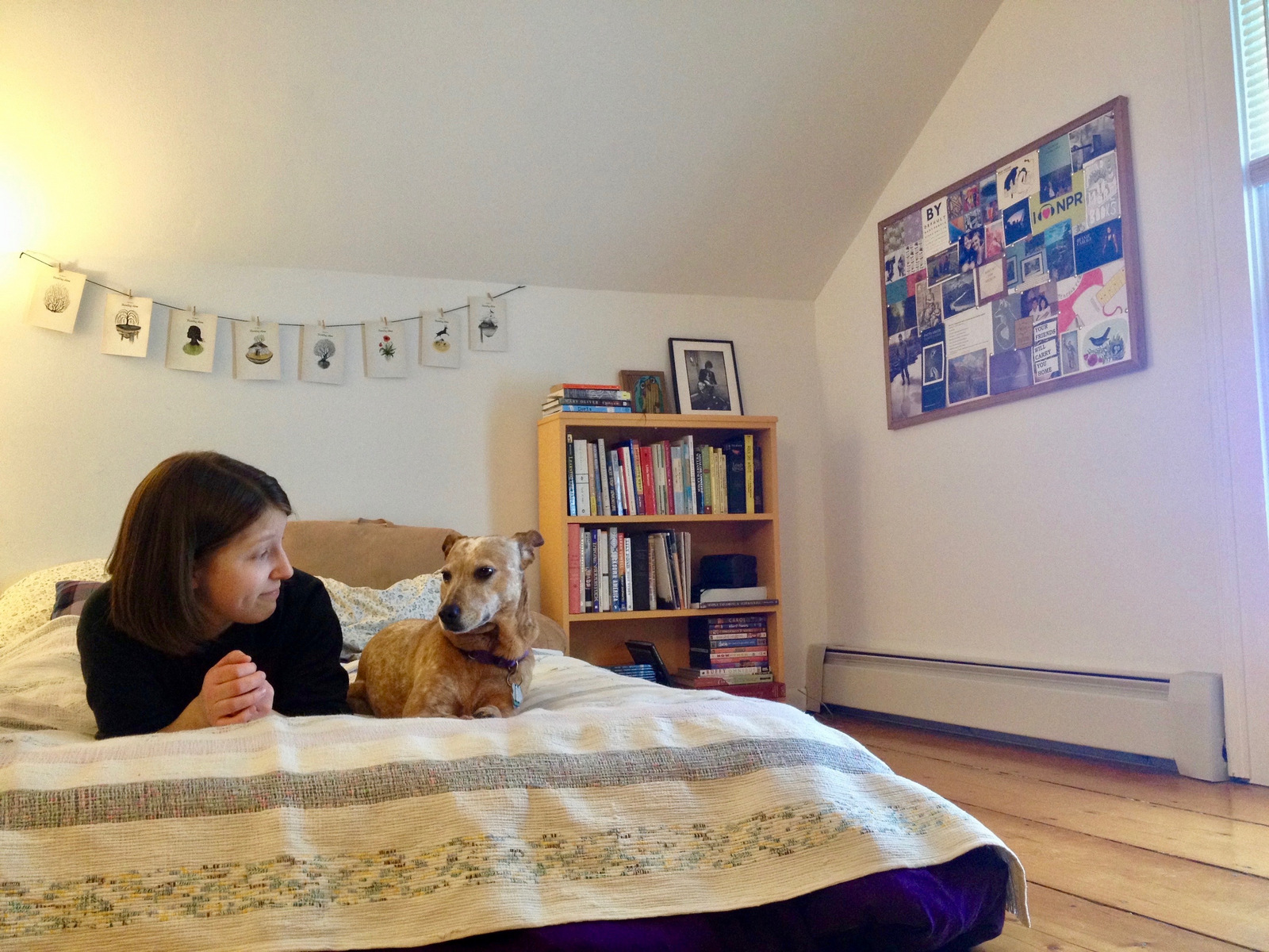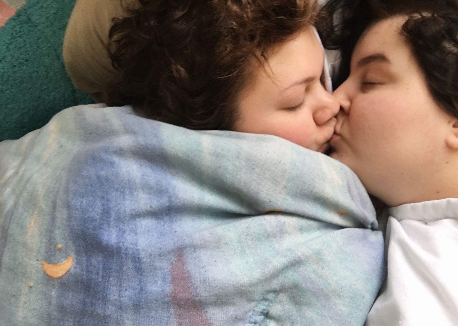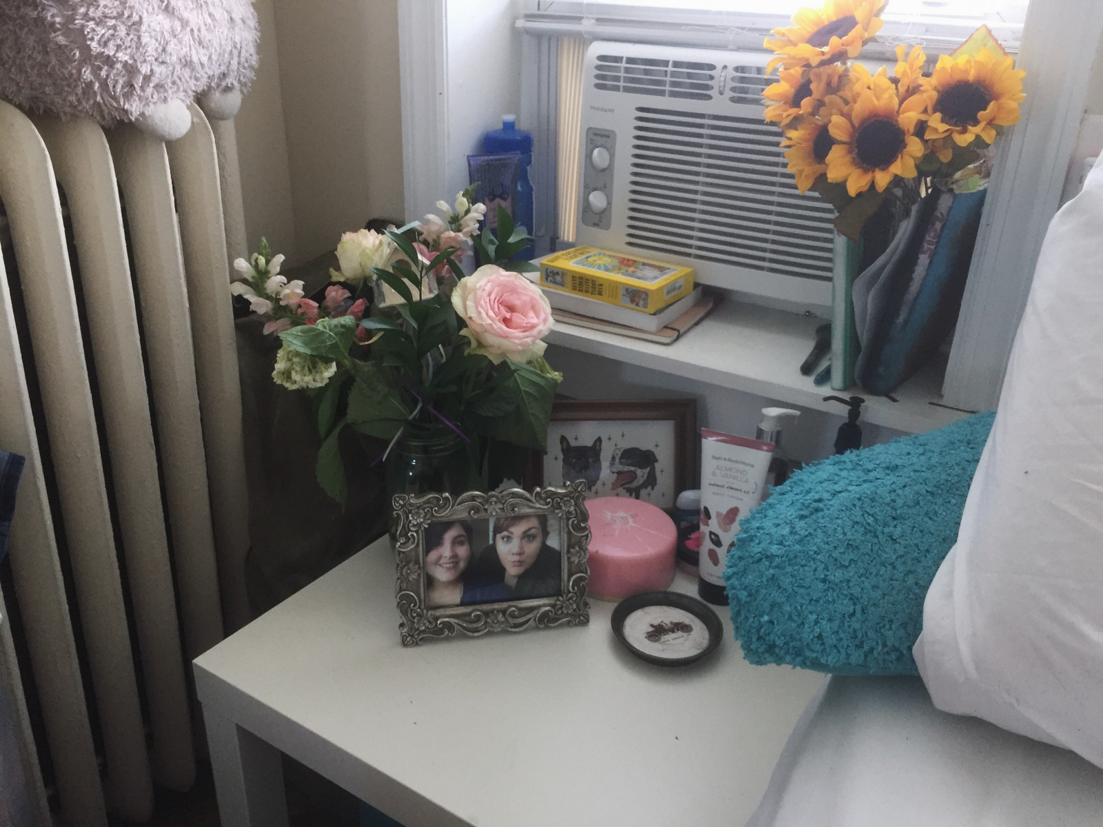 “The room looks over an abandoned elementary school playground, but neighborhood children are always playing there so we can hear their laughs and games through the windows. We have a twin mattress we found in the attic on top of a futon. The last thing I (Abby) think about is how good Clara’s arms feel around me and how I wish the dog would stop barking!”