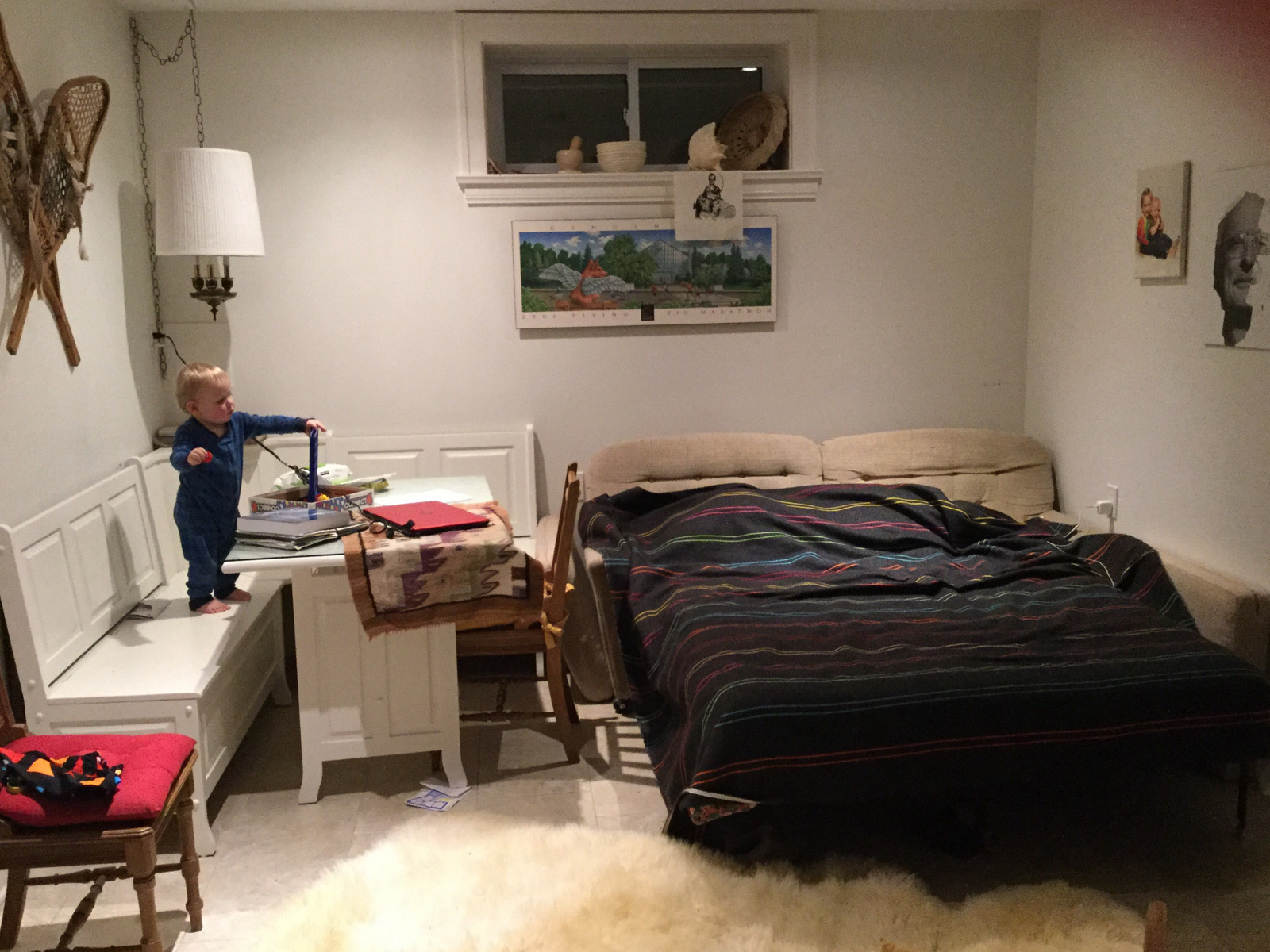 “This is indeed a basement suite. The kids have real beds in their own room; don’t worry. Here the smallest one is playing Connect Four. I’m a bit concerned about being judged by submitting this, but the realness of the last gallery was inspiring, so here it is. I’ve applied for graduate programs and we’re planning to move in the summer to some place that’s really ours. For now, this is my bedroom. That weird poster on the wall is from when I ran the Cincinnati flying pig marathon. The other pictures are of my dad and my kids.”