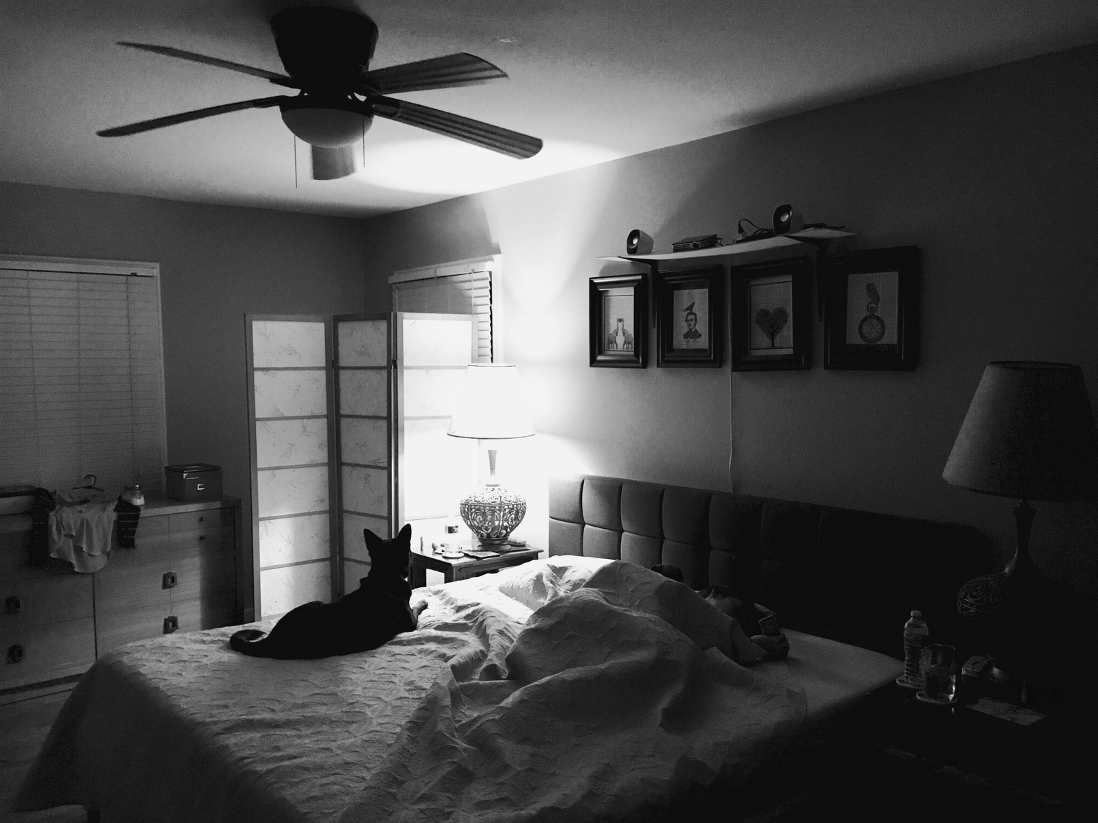 “Our bedroom is awesome. I mostly enjoy that I share it with my wife (seen here fetal-position-phone-Facebooking while our dog looks out into nothingness/the noises in the backyard) and it’s cozy for both of us. It’s way too ridiculously huge for us, but we’ve filled it out nicely with a king sized bed (which we collectively only fill half of), a sweet projector set up, and some artsy shit on the walls. I like it.”
