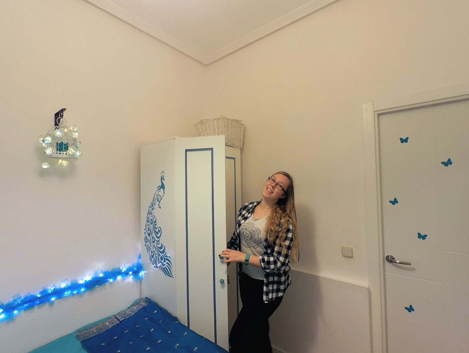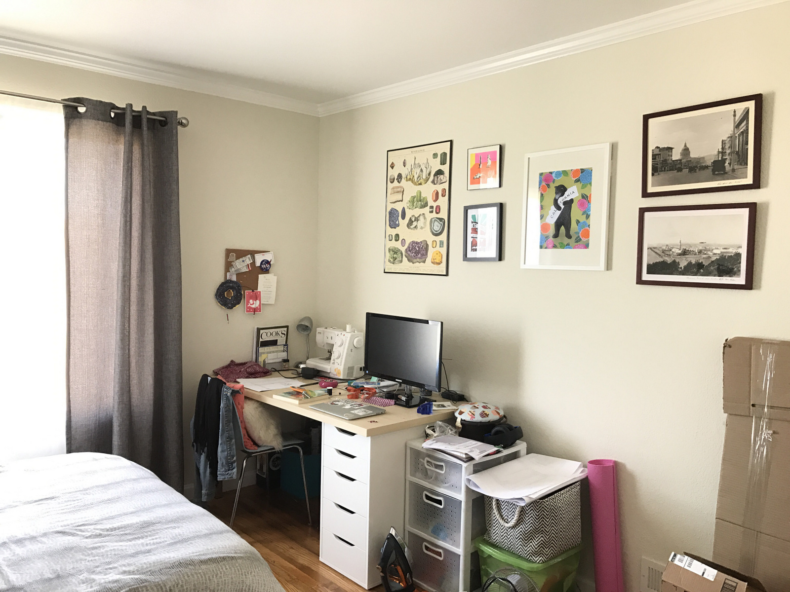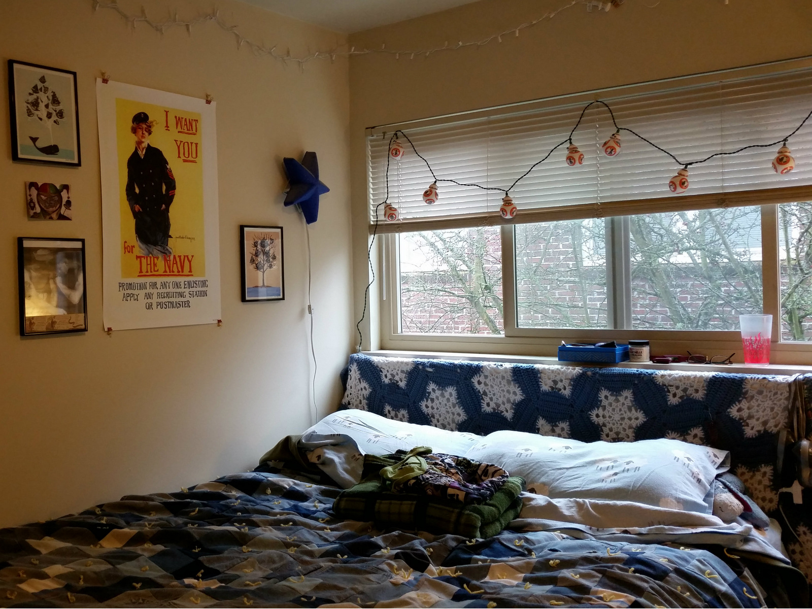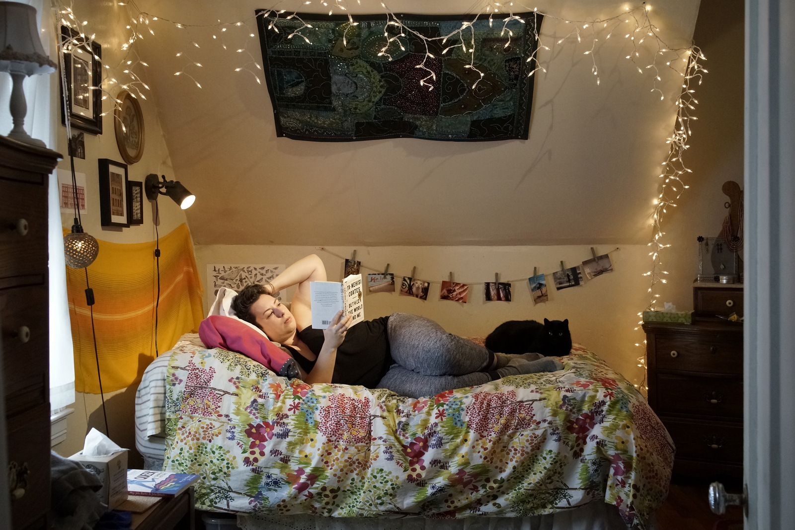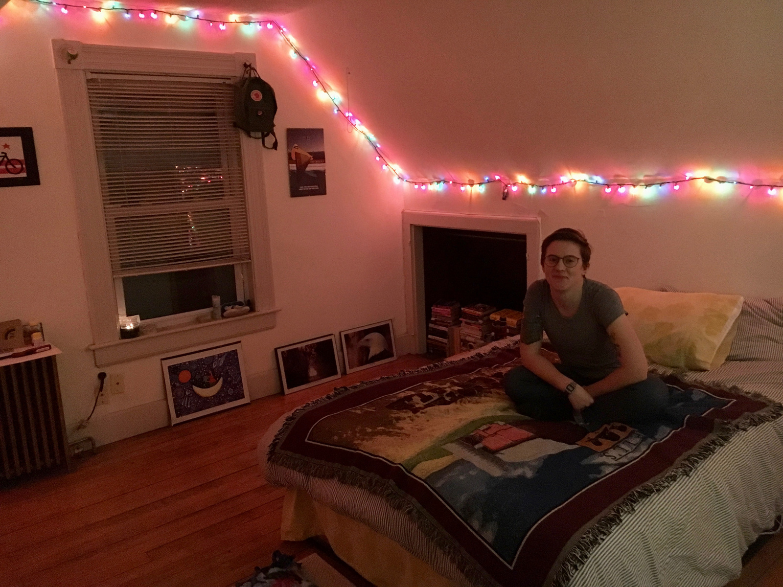 “I just settled into this room after living in four different houses over the last six months while moving around for my company, and it’s a huge relief to be here. So far my favorite things about it are how much light it gets during the day, and the rainbow twinkly lights my girlfriend hung for me. I usually fall asleep thinking about tomorrow’s breakfast.”
