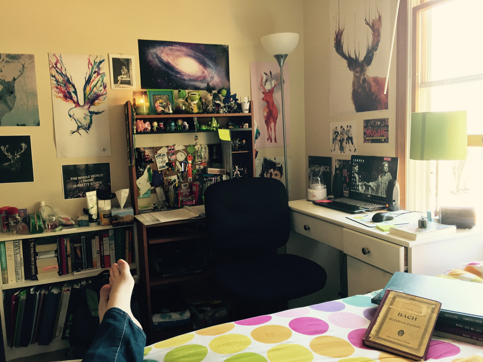 “Björk has been an inspiration to me creatively since December 2013 when I listened to her and thought about music in a way I never had before: I called it a musical epiphany. Behind me hang character descriptions for a fiction series that I’ve been working on for almost a year. Having both at the head of my bed remind me how important art and creativity are to me, and to continue working toward sharing mine with others.”