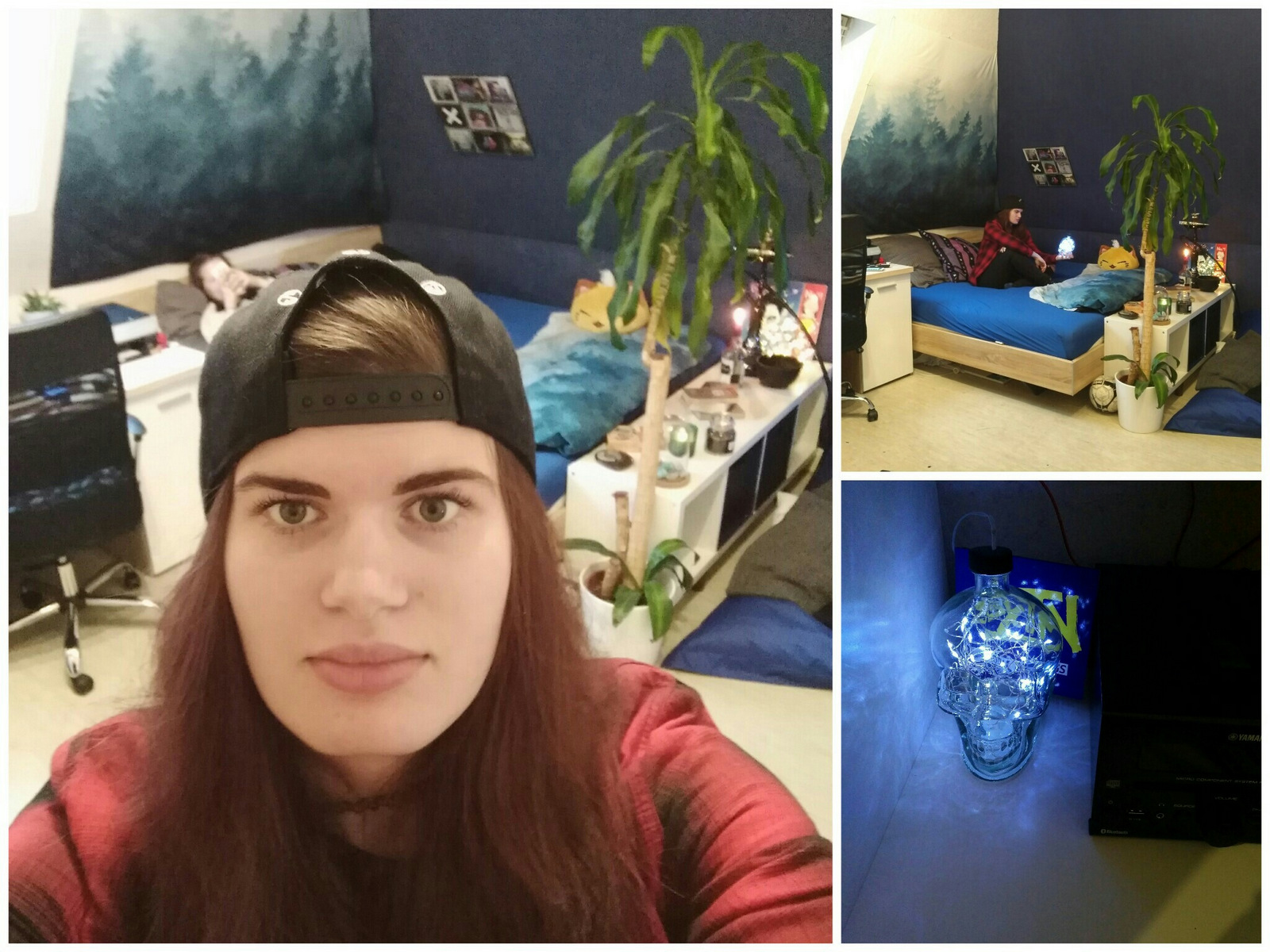 “I’m sharing a home with four flatmates (including my sister pictured in the background), so my bedroom contains basically everything that I own (minus kitchen stuff) and is a bit clutterd, but I love it anyway. My favourite things in my room are my skull-lamp, which I made out of an empty bottle of terrible margarita-mix and my Tarot cards – I started tarot-reading thanks to Autostraddle’s “Fool’s Journey” column!”