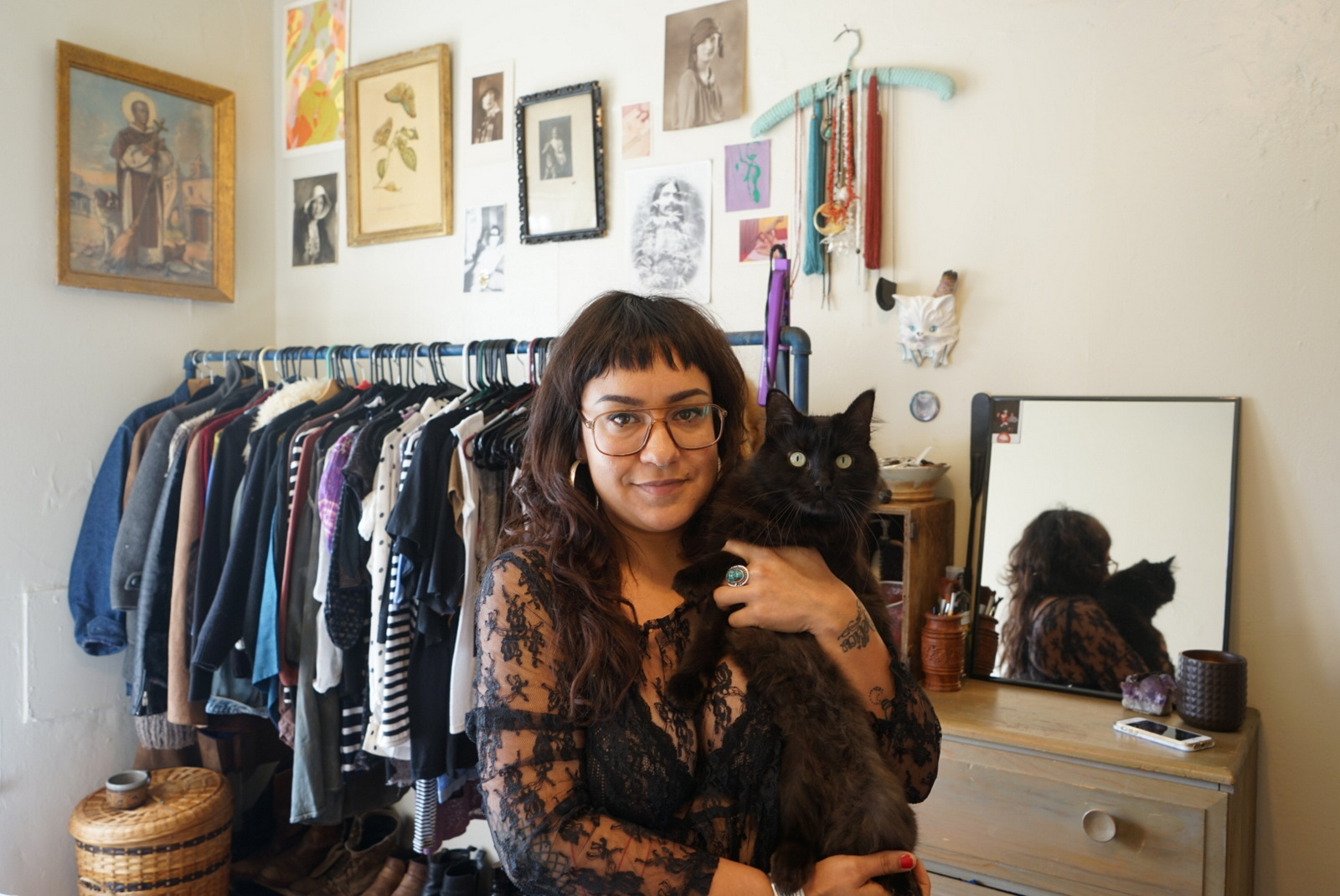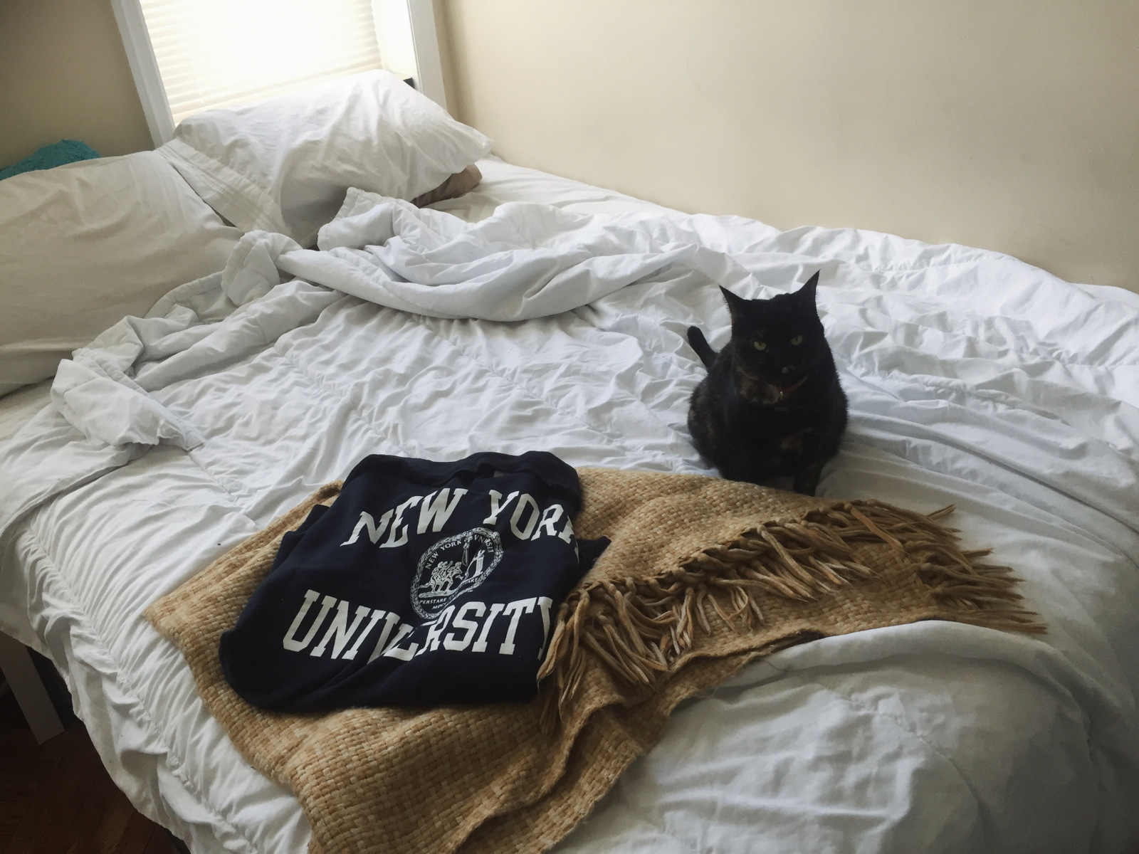 “The bedroom was a big selling point for this apartment, we love how much light comes in. Our cat is named Stevie Nicks and she likes to sleep between our legs.”