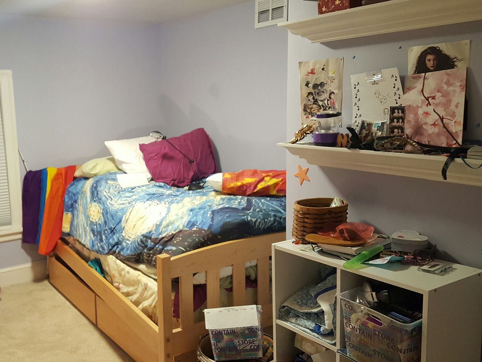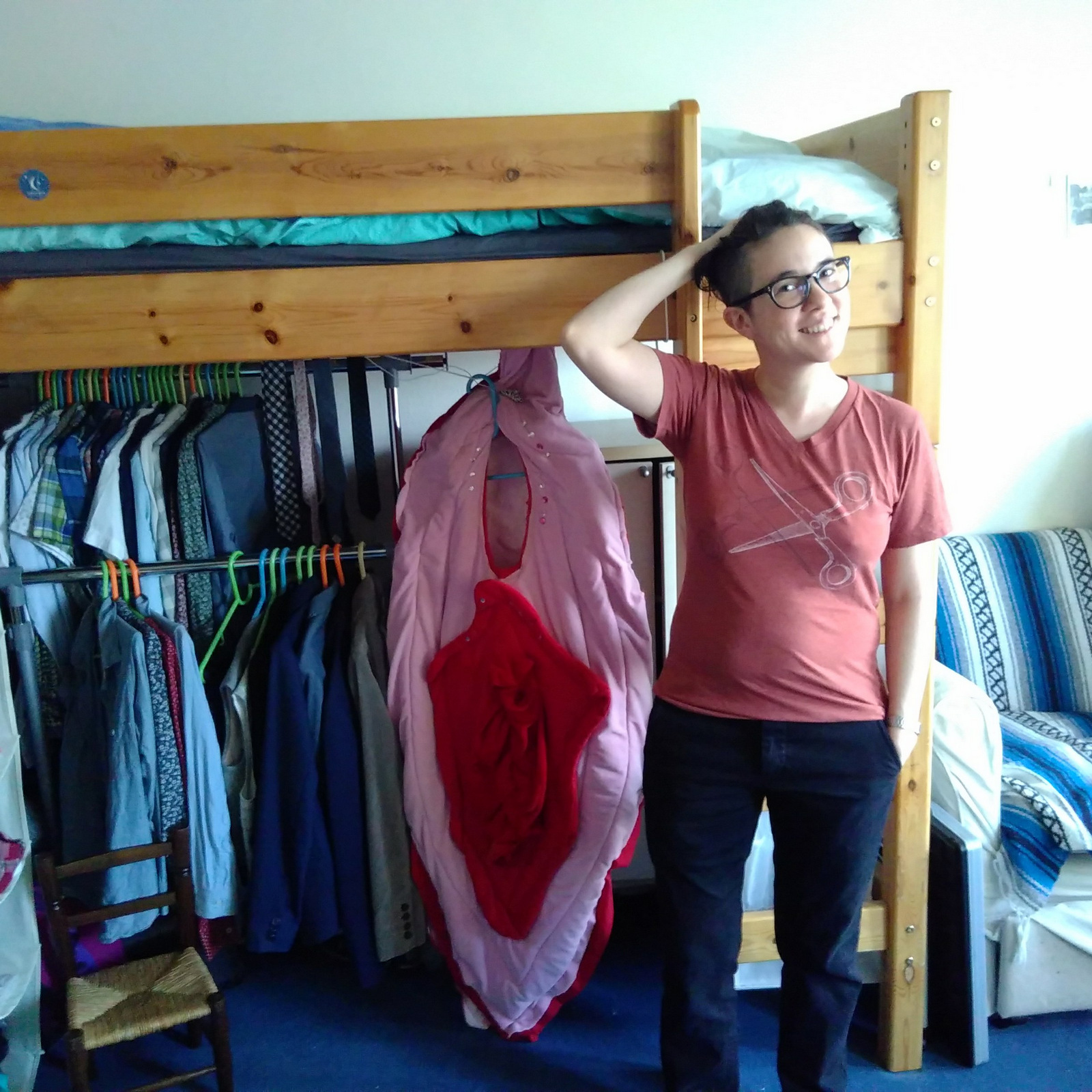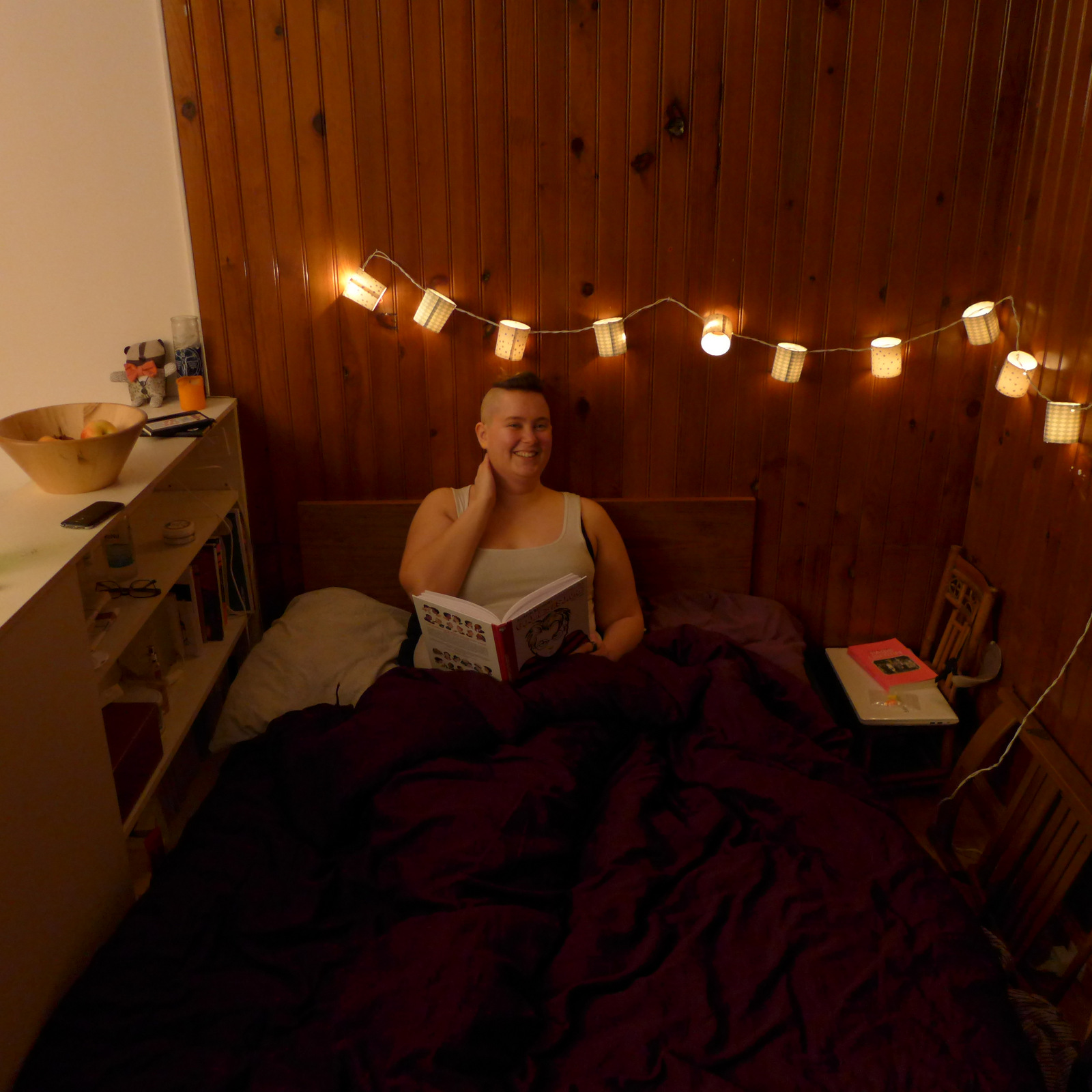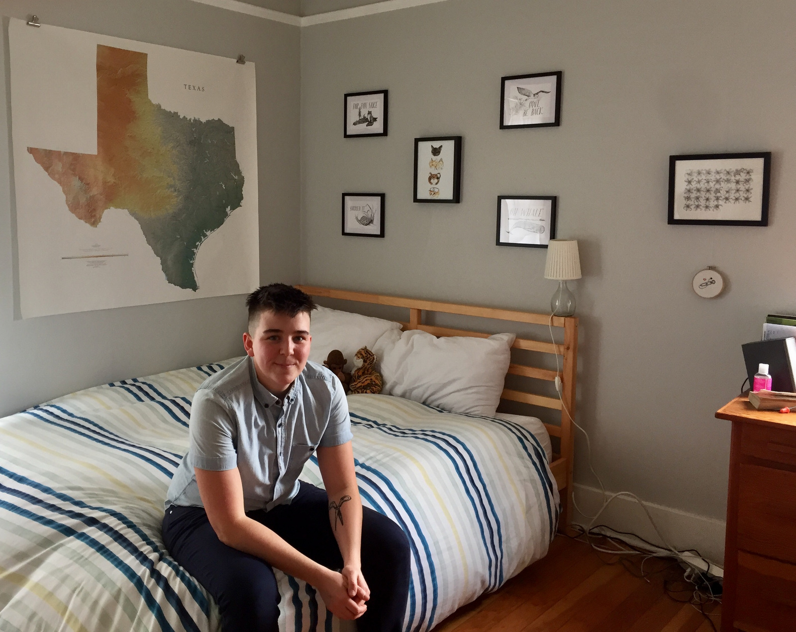 “I love that my room is a refurbished attic, and hate how hot it gets in the summer. The last thing I think about at night is the book I fall asleep reading, and the first thing is usually how much I hate alarms. My favorite thing is my giant Captain America shield, because for some reason that fandom has put me in touch with more queers than I’d ever met before!”