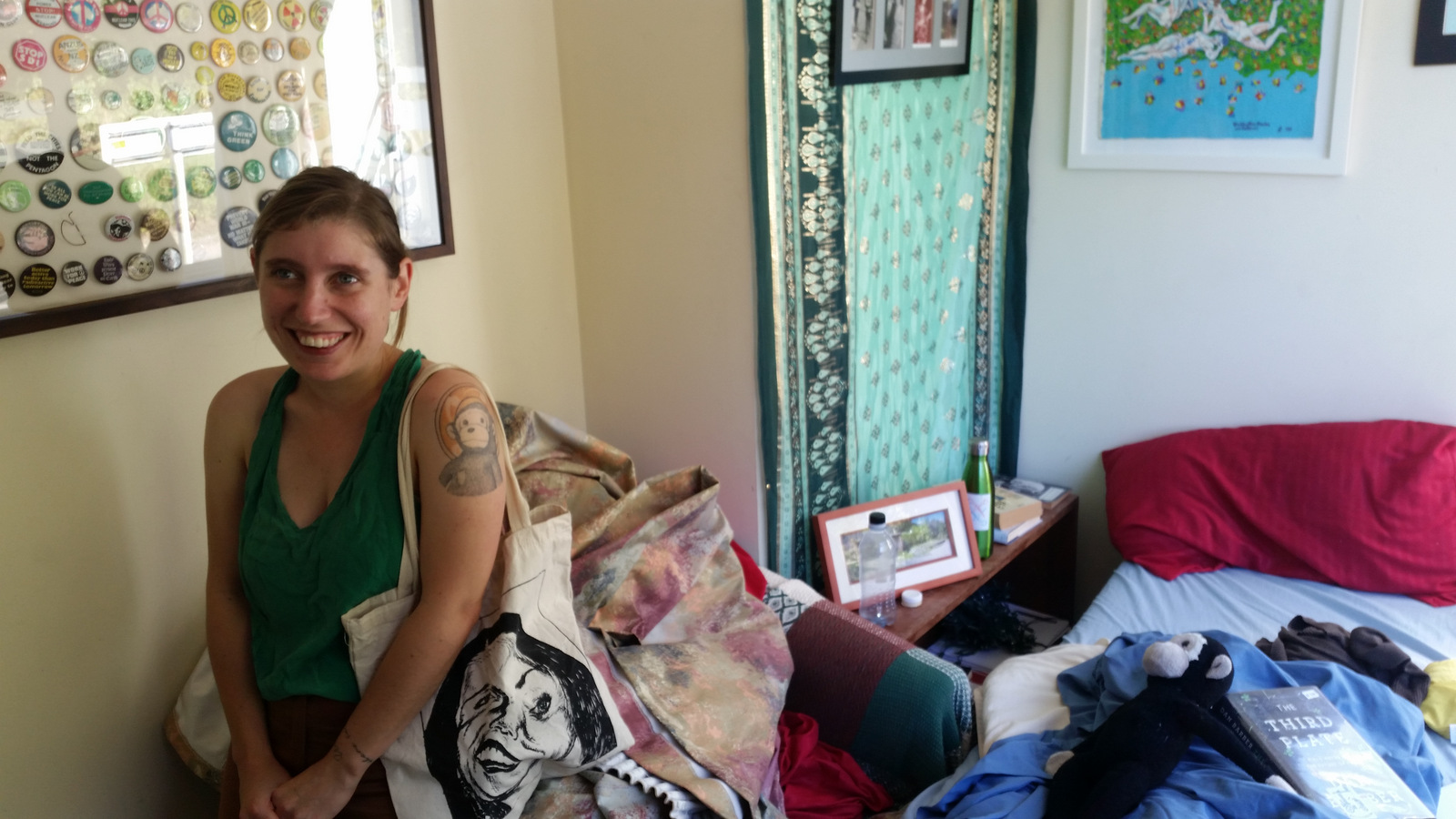 “My room is ok, I’m not very good at nesting. It’s small, I like that or had no carpet. I just got some new (to me) curtains and they really tie the room together (I’m sitting on left overs). My favourite thing is my toy monkey/BFF seen on the bed. He’s a good friend. The badges behind me are my dads campaign for nuclear disarmament time! One says ‘war is menstruation envy’. The other day I left a curtain open over night and the first thing I saw in the morning was the moon!”